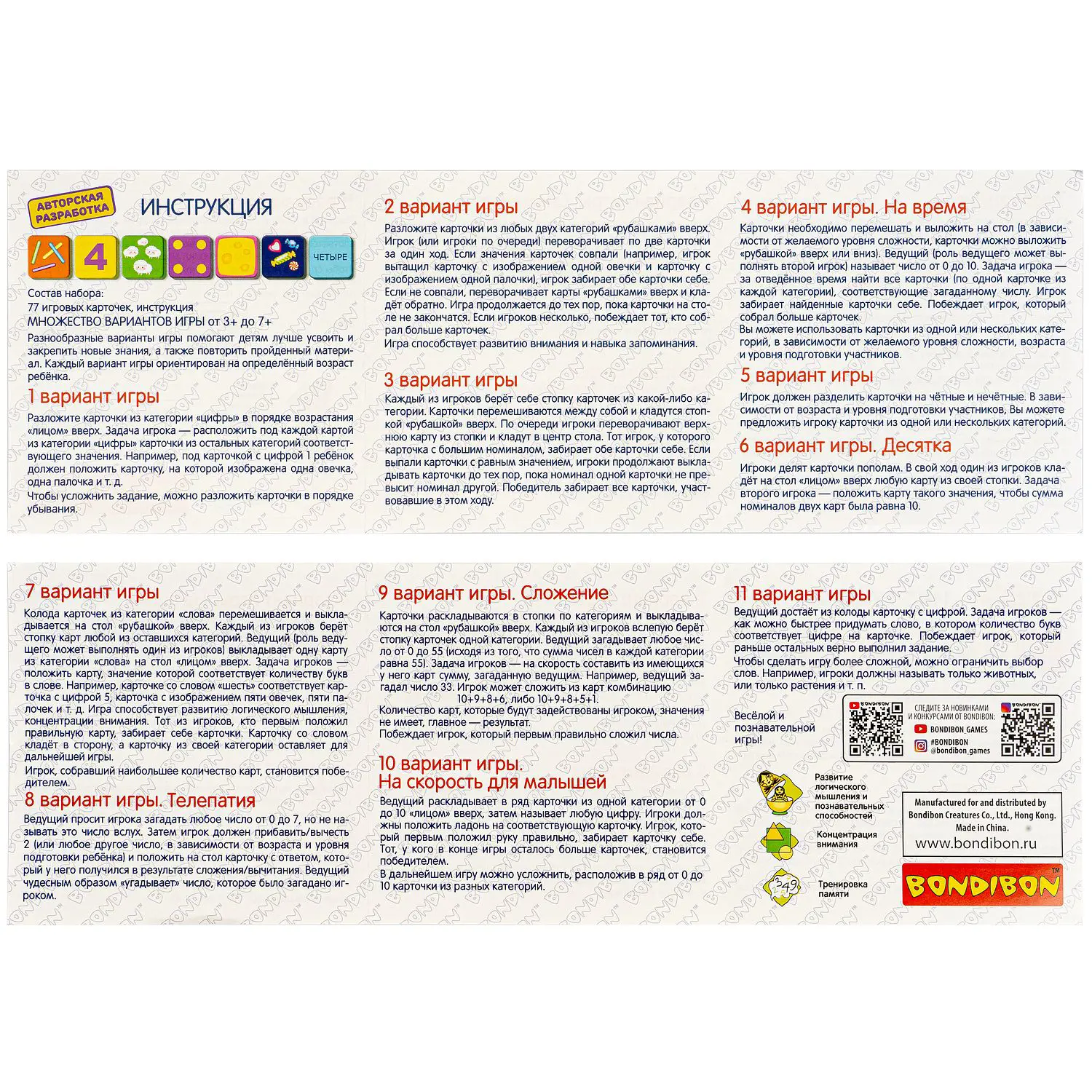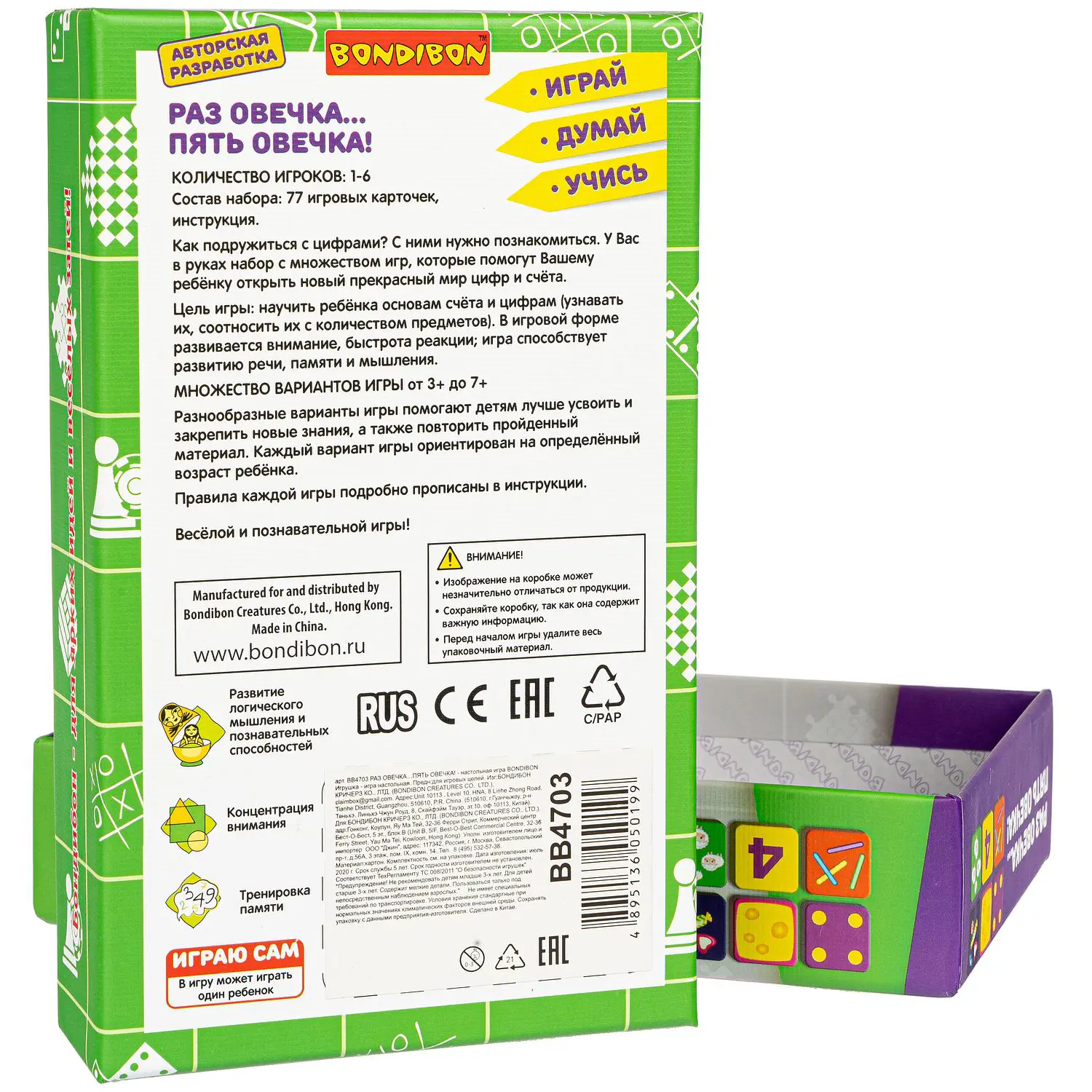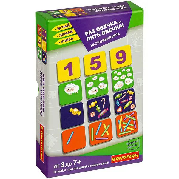 Настольная игра "РАЗ ОВЕЧКА…ПЯТЬ ОВЕЧКА!" серии "Играй Думай Учись" (ИДУ) от Bondibon - это 11 ВАРИАНТОВ ИГРЫ авторской разработки. В игровой форме развивается внимание, быстрота реакции; игра способствует развитию речи, памяти и мышления. Цель игры: познакомить ребят с цифрами, основами счёта.