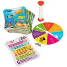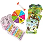 В комплект входят: 32 ярких картинки с шестью вопросами на каждой из них, рулетка, песочные часы.