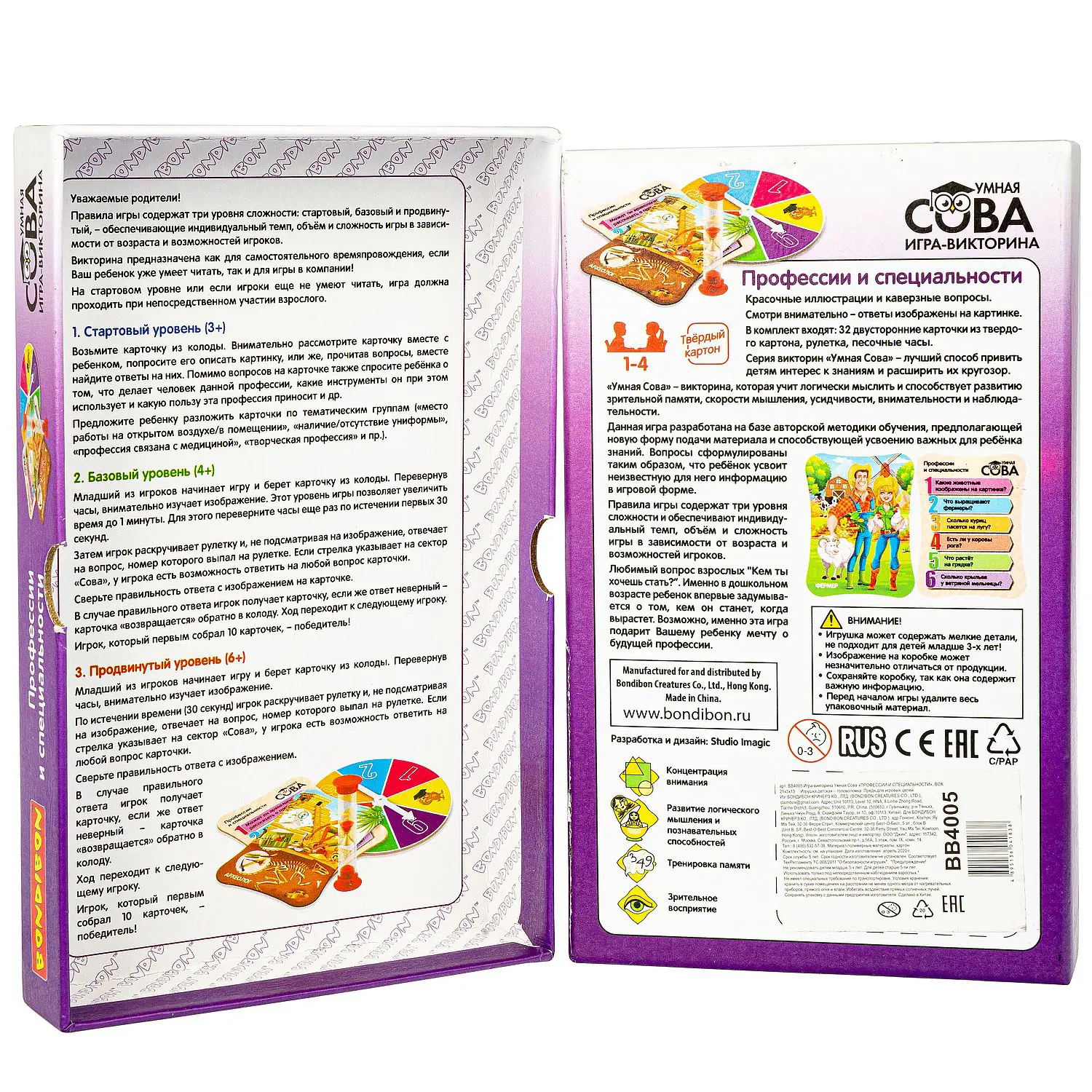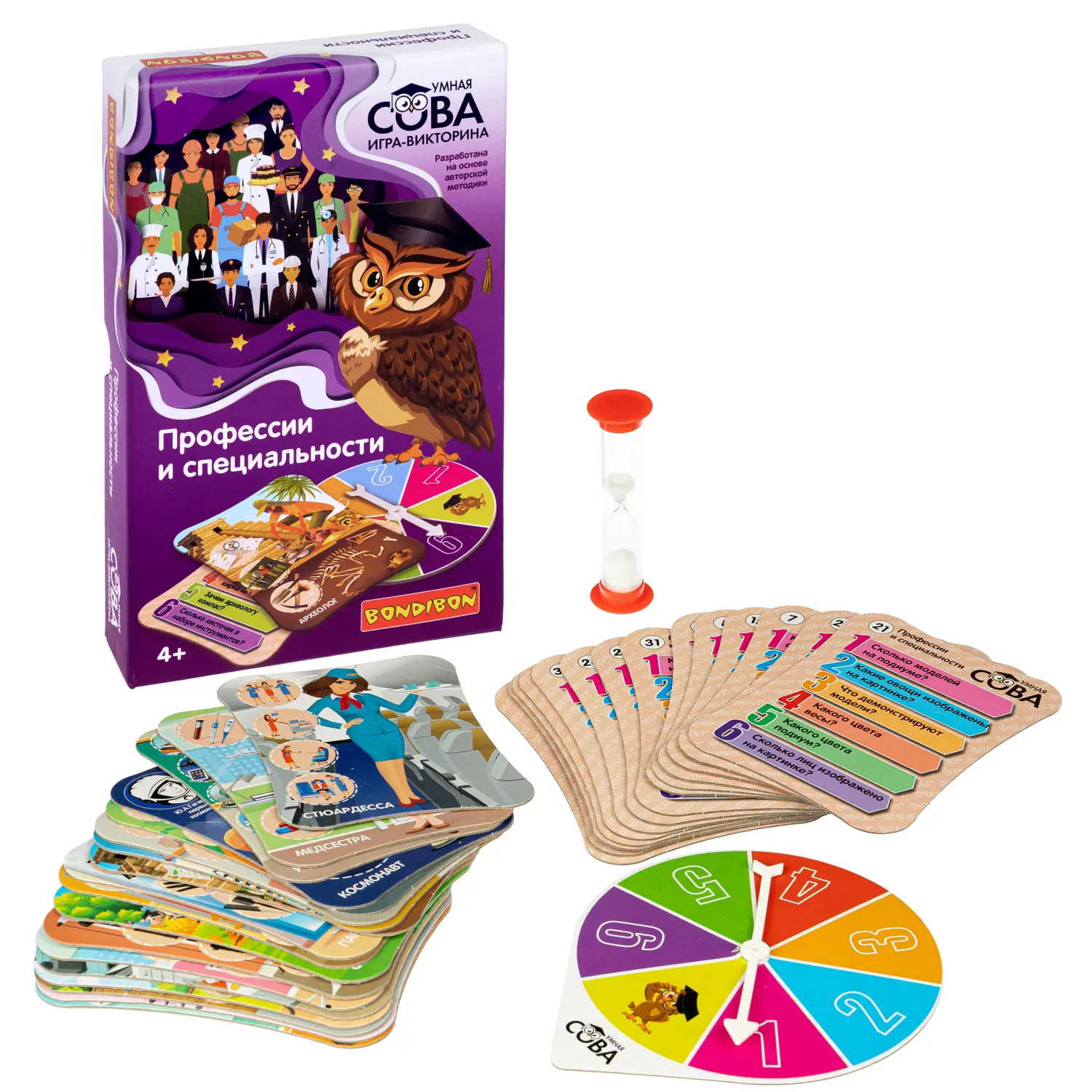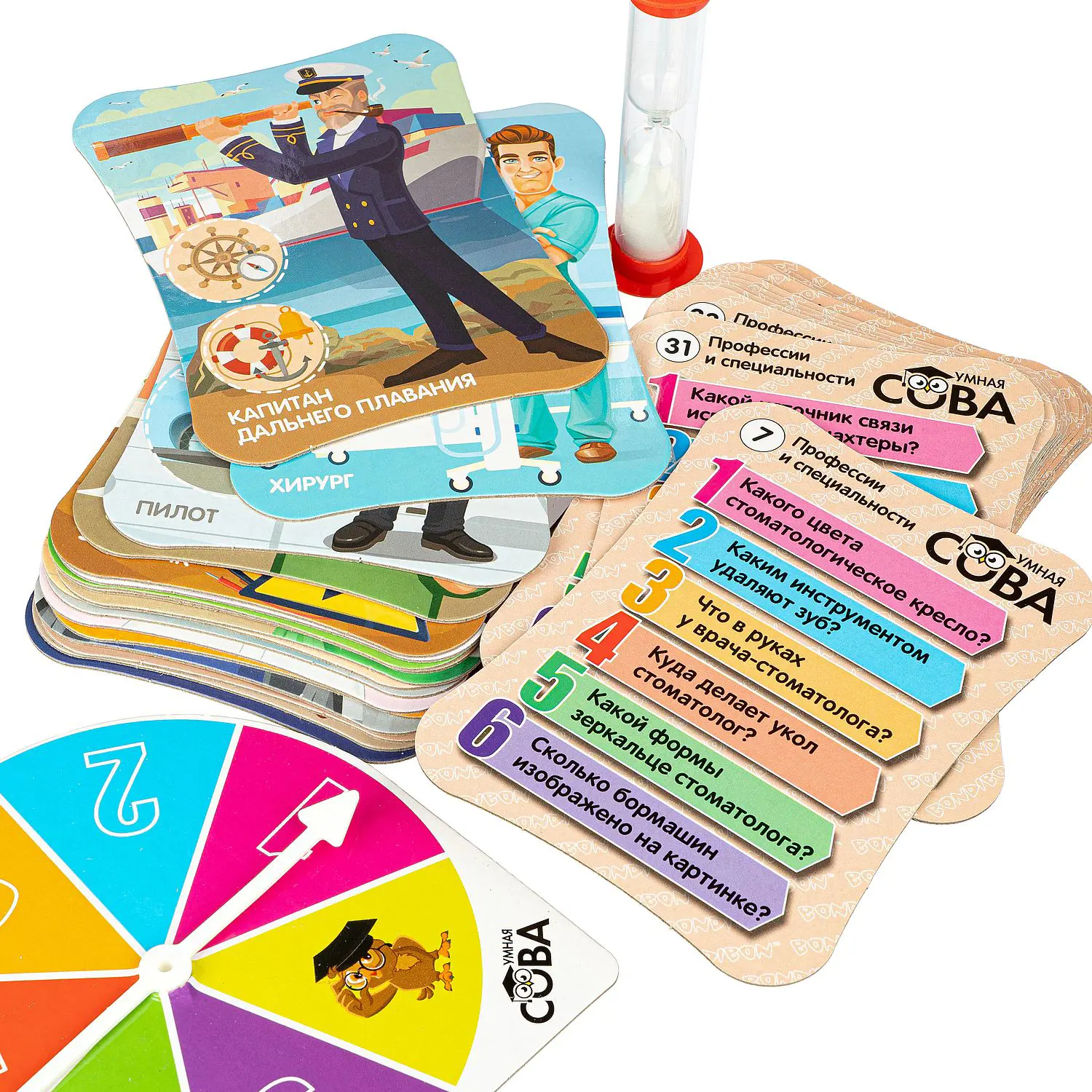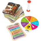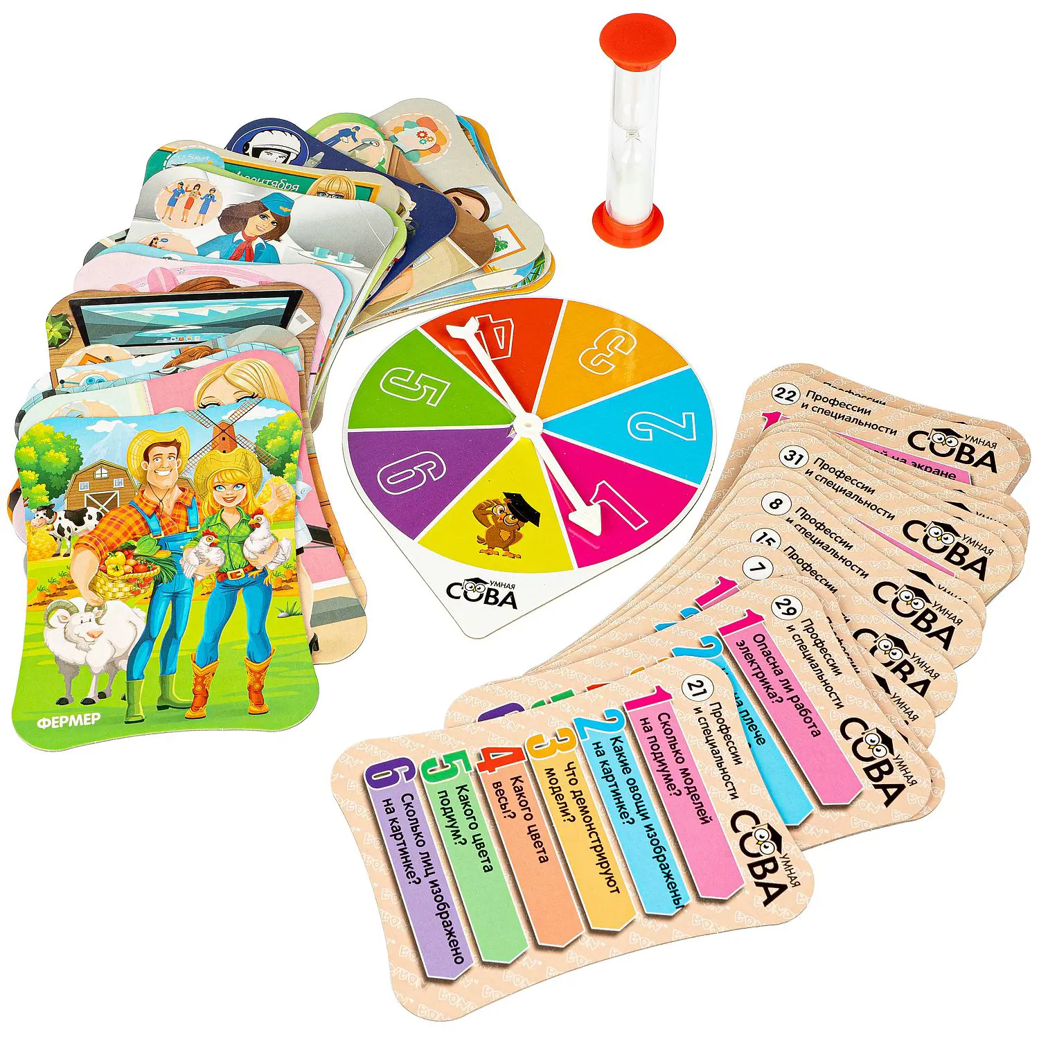 В комплект входят: 32 ярких картинки с шестью вопросами на каждой из них, рулетка, песочные часы.