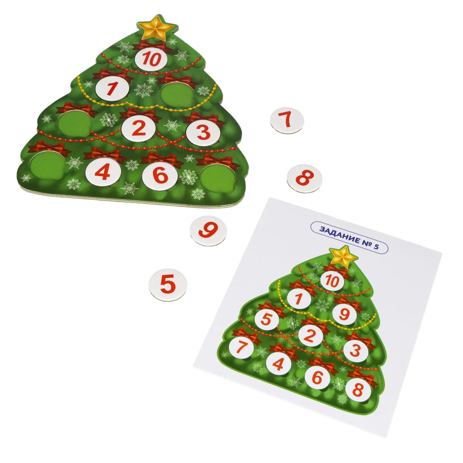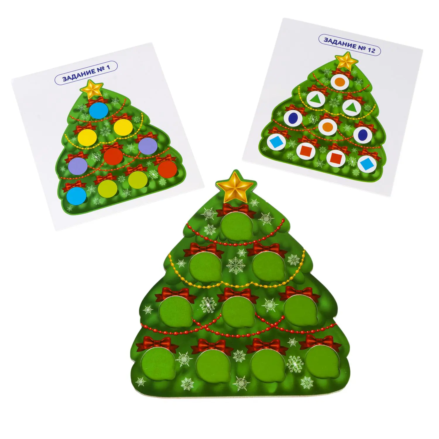 Кроме ёлочки, в игровой набор входят: 30 фишек, 12 карточек с заданиями, инструкция. Возраст 1,5+