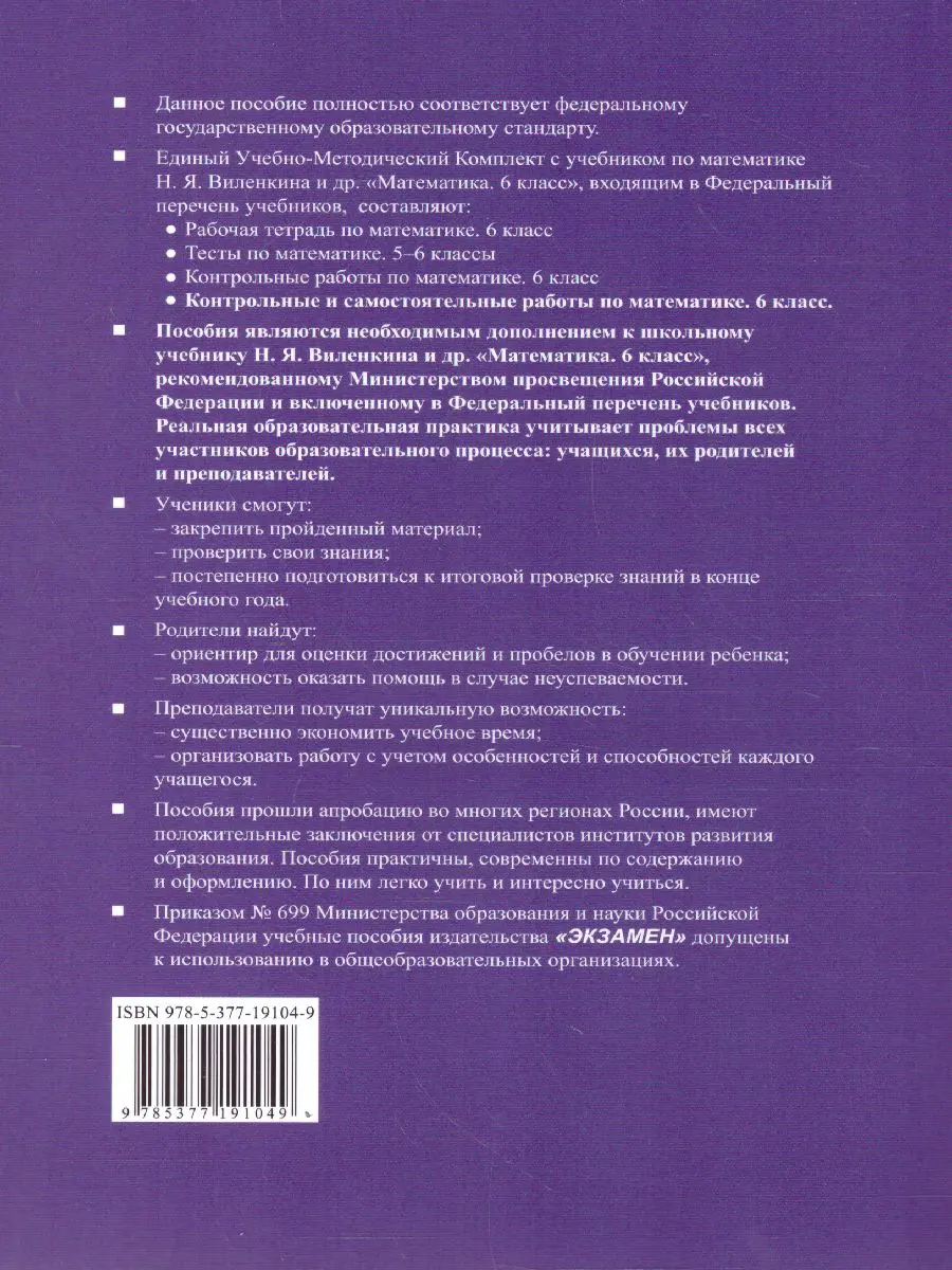 Пособие является необходимым дополнением к школьному учебнику Н. Я. Виленкина и др. "Математика. 6 класс", рекомендованному Министерством образования и науки Российской Федерации и включенному в Федеральный перечень учебников.