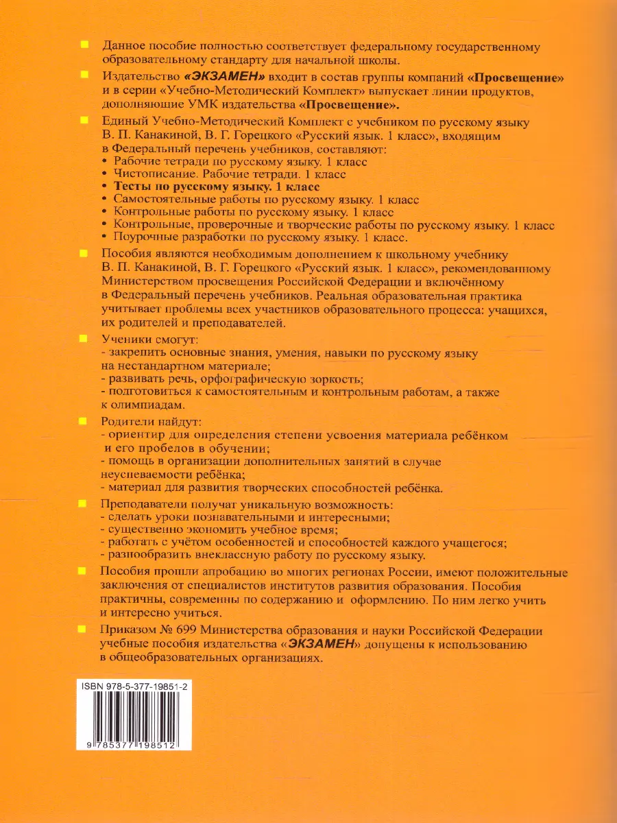 Данный сборник с тестами предназначен для тематического и итогового контроля знаний учащихся по основным разделам учебника "Русский язык. 1 класс" (авт. В. П. Канакина, В. Г. Горецкий).