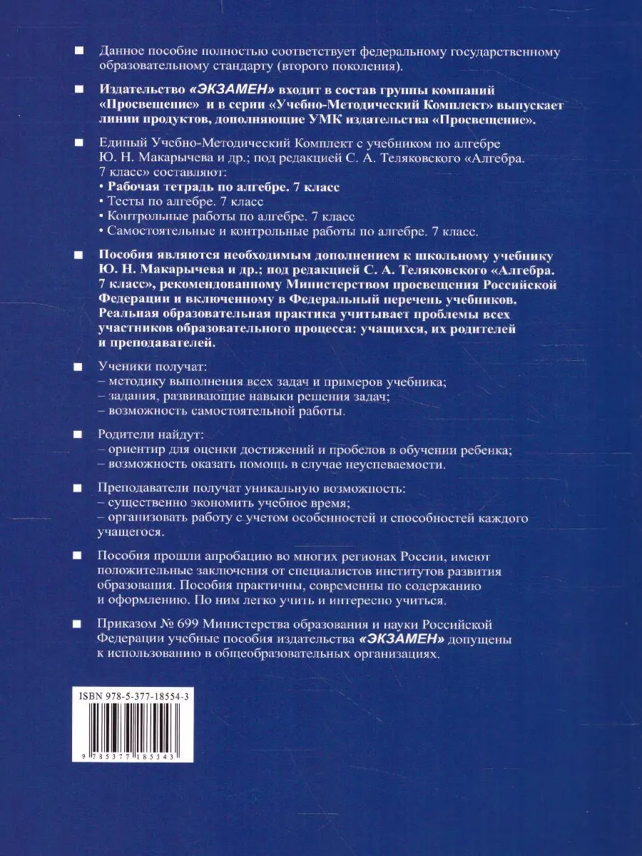 Рабочая тетрадь является необходимым дополнением к школьному учебнику Ю. Н. Макарычева и др.; под редакцией С. А. Теляковского "Алгебра. 7 класс", рекомендованному Министерством образования и науки Российской Федерации и включенному в Федеральный перечень учебников.