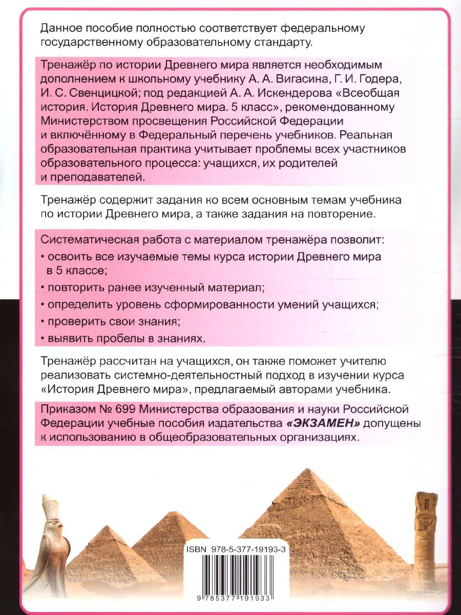 Данное пособие полностью соответствует федеральному государственному образовательному стандарту. Тренажёр включает задания по истории Древнего мира, которые соответствуют содержанию и структуре учебника "Всеобщая история.