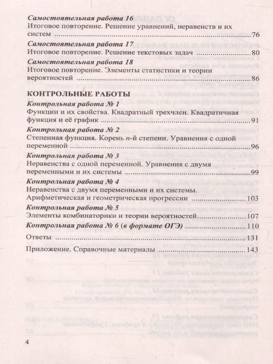 Сборник содержит тексты 18 самостоятельных и 6 контрольных работ для формирования знаний, умений и навыков учащихся, предусмотренных программой курса алгебры 9 класса, и текущего контроля результатов обучения. Каждый текст самостоятельной и контрольной работы представлен в 4 вариантах равной трудности. В сборник включены также ответы к заданиям, рекомендации по подсчету баллов и выставлению отметок. Планируемое время выполнения каждой самостоятельной работы - 30 минут, каждой контрольной работы - 40 минут.