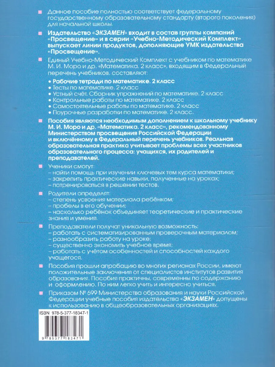 Данное пособие полностью соответствует федеральному государственному образовательному стандарту (второго поколения) для начальной школы. Рабочая тетрадь по математике предназначена для самостоятельной работы учащихся. Задания в тетради соответствуют учебнику М.И. Моро и др. "Математика. 2 класс".