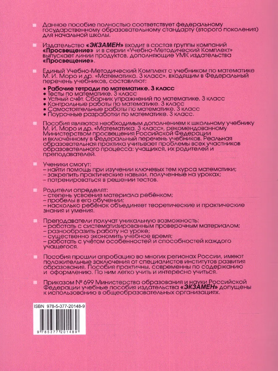 Рабочая тетрадь по математике предназначена для самостоятельной работы учащихся. Задания в тетрадях соответствуют учебнику М. И. Моро и др. "Математика. 3 класс".