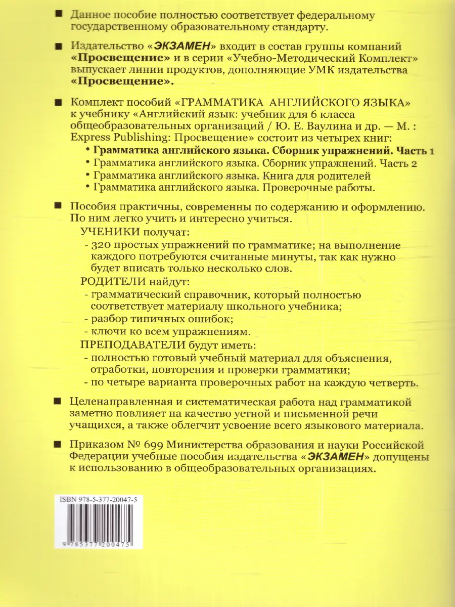 Оно представляет собой первую часть учебного комплекта, состоящего из четырёх книг: -Грамматика английского языка. Сборник упражнений. Часть 1 -Грамматика английского языка. Сборник упражнений. Часть 2 -Грамматика английского языка. Книга для родителей -Грамматика английского языка. Проверочные работы.