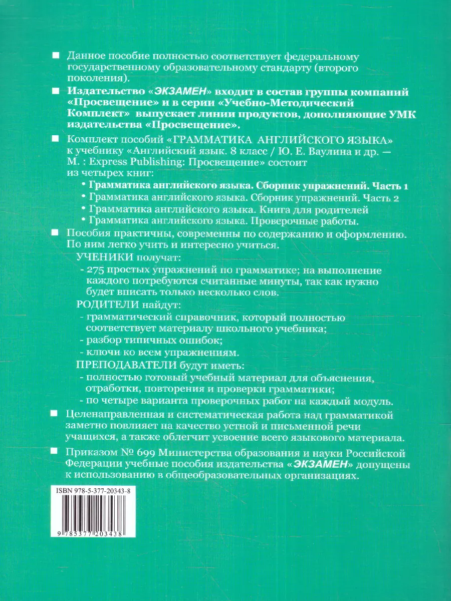 Оно представляет собой первую часть учебного комплекта, состоящего из четырёх книг: - Грамматика английского языка. Сборник упражнений. Часть 1 - Грамматика английского языка. Сборник упражнений. Часть 2 - Грамматика английского языка. Книга для родителей - Грамматика английского языка. Проверочные работы.
