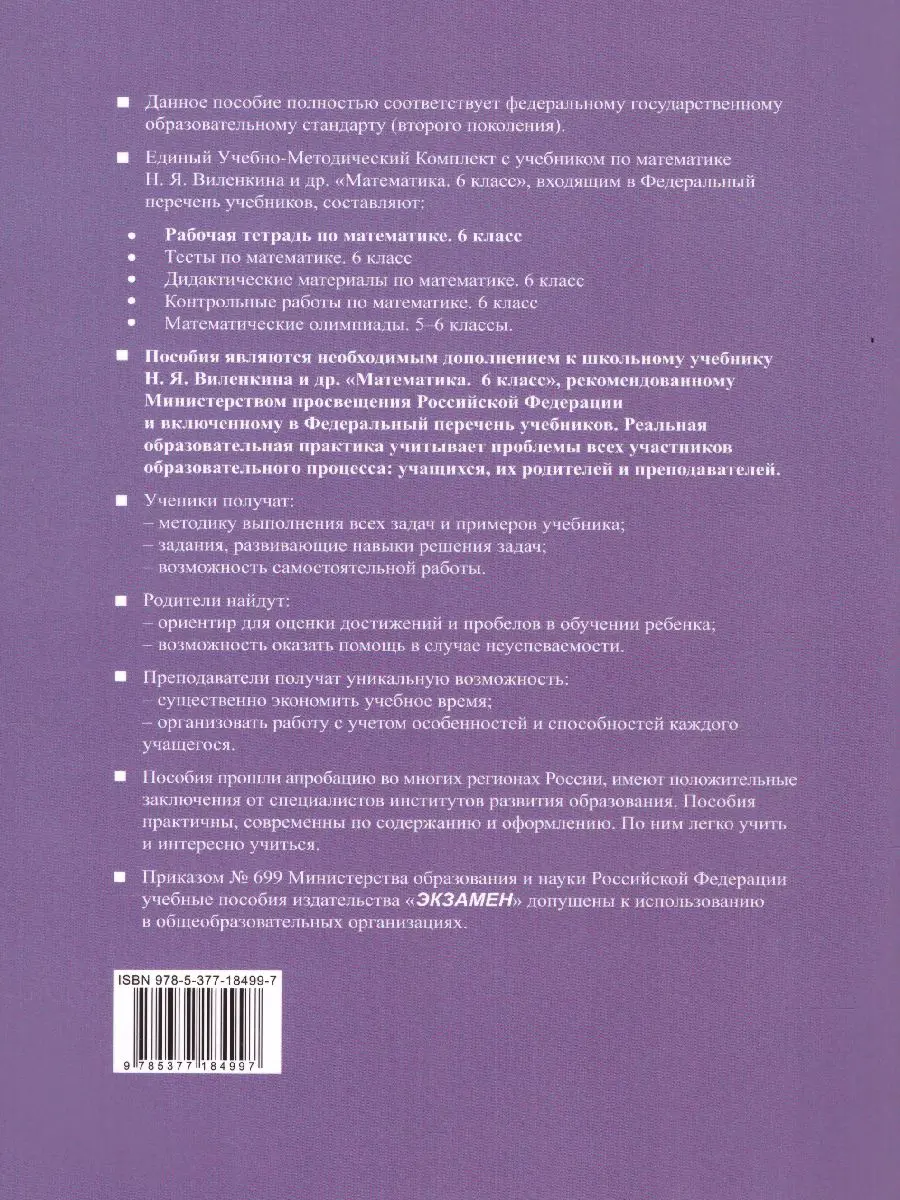 Данное пособие полностью соответствует федеральному государственному образовательному стандарту (второго поколения). Рабочая тетрадь является необходимым дополнением к школьному учебнику Н. Я. Виленкина и др. "Математика. 6 класс: в 2 ч. Ч. 1" (издательство "Мнемозина"), рекомендованному Министерством просвещения Российской Федерации и включенному в Федеральный перечень учебников.