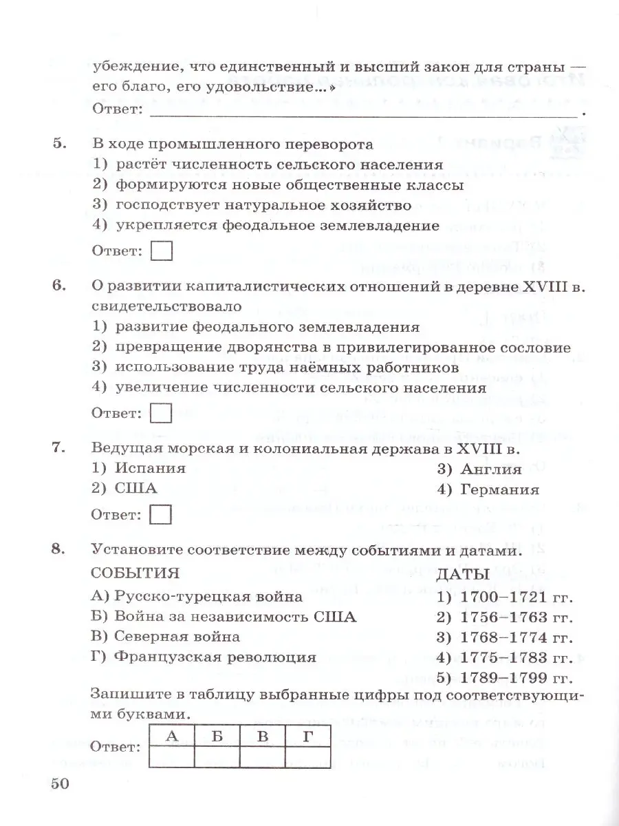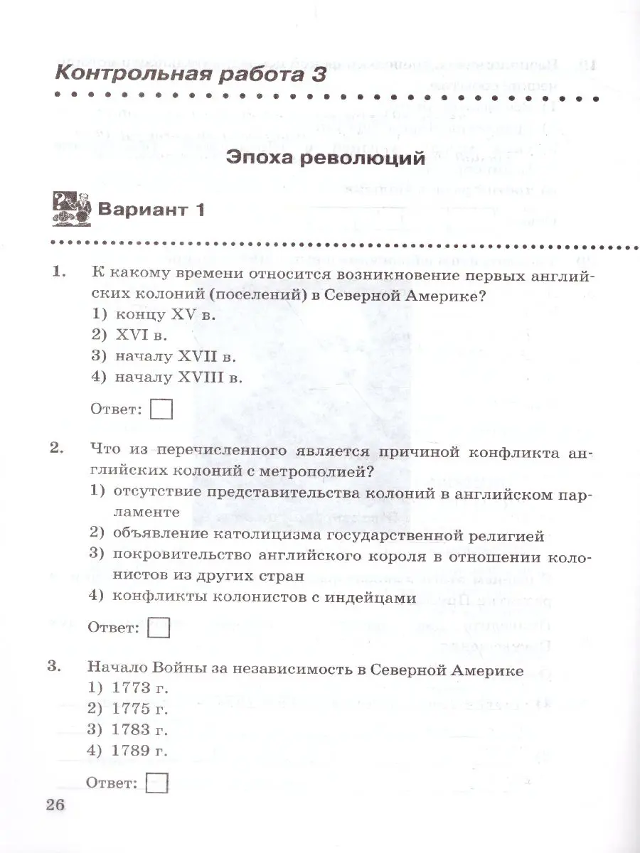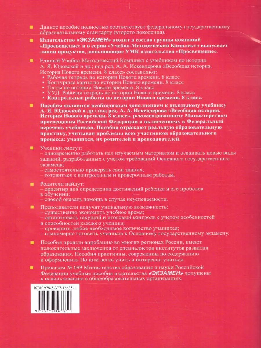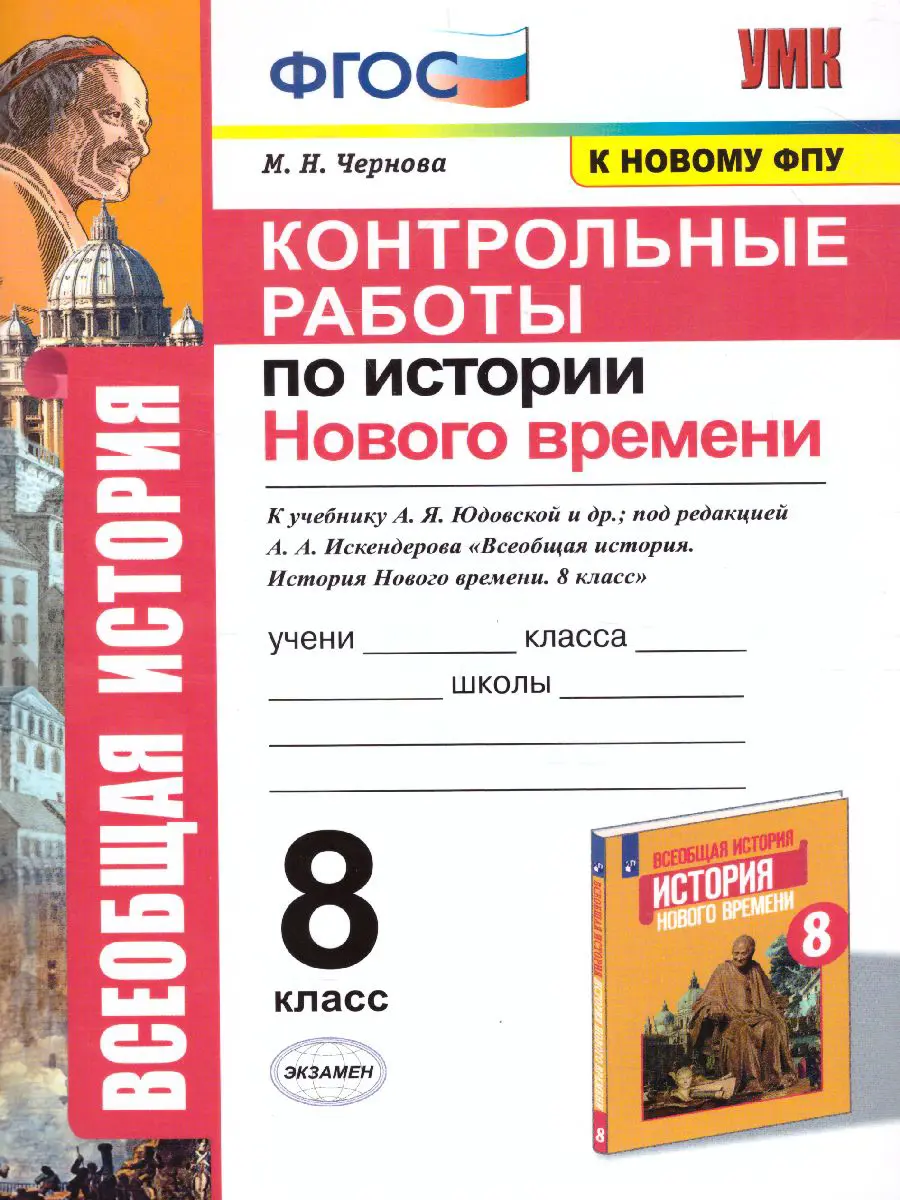 Данное пособие полностью соответствует федеральному государственному образовательному стандарту (второго поколения). Пособие соответствует содержанию и структуре учебника А.Я. Юдовской и др.; под редакцией А.А. Искендерова по истории Нового времени для 8 класса и содержит контрольные работы (в двух вариантах) к каждому разделу учебника, а также два варианта итоговой контрольной работы по всему курсу истории Нового времени в 8 классе. Контрольные работы помогут проверить знание ключевых дат, фактов, имён, понятий, причинно-следственных связей, а также будут полезны в качестве обучающих познавательных заданий. Ко всем контрольным работам даны ответы. Пособие предназначено учащимся 8 классов, учителям и методистам.