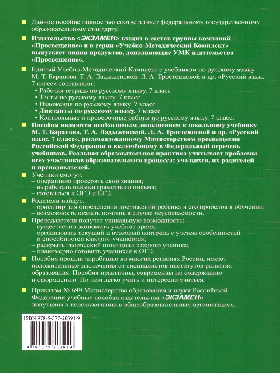 Русский язык 7 класс. Диктанты к учебнику М.Т. Баранова, Т.А. Ладыженской и др. ФГОС Новый (к новому учебнику). Данное пособие полностью соответствует федеральному государственному образовательному стандарту.