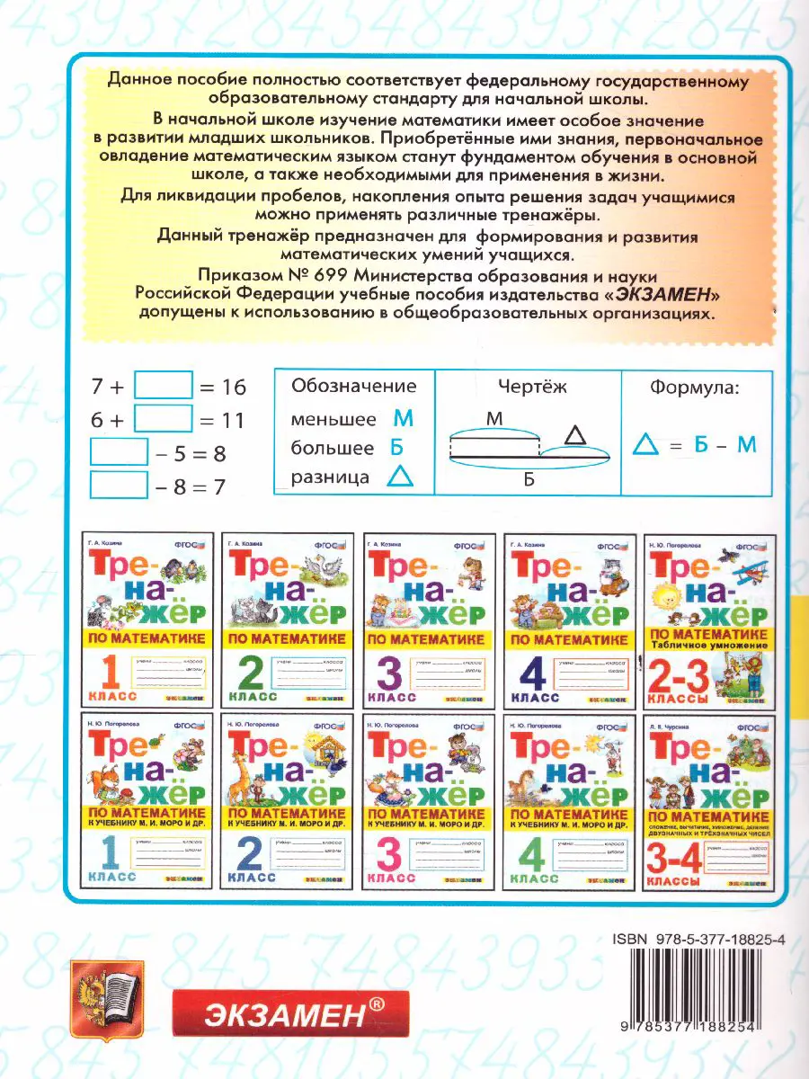 Данное пособие полностью соответствует федеральному государственному образовательному стандарту (второго поколения) для начальной школы. Пособие содержит разнообразные задания по всем основным разделам математики и имеет целью оказать взрослым помощь в подборе упражнений для повторения, закрепления и систематизации математических знаний у детей. В пособии приведено достаточное число упражнений, способствующих выработке навыков устных и письменных вычислений, сравнения чисел, измерений и построений, решения задач, определения времени.