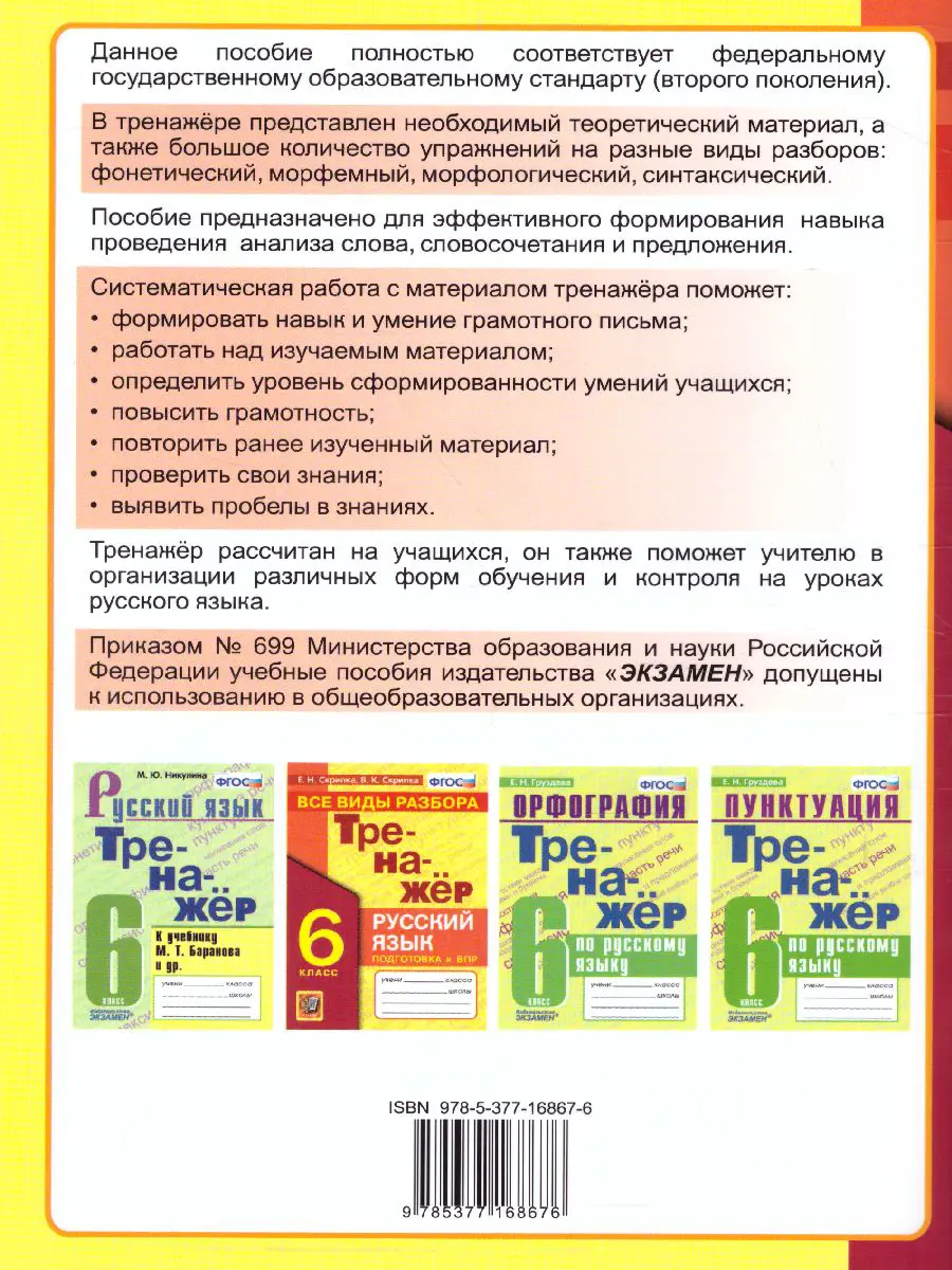 Данное пособие полностью соответствует федеральному государственному образовательному стандарту (второго поколения). Тренажёр содержит большое количество упражнений по всем видам разбора, изучаемым в 6-м классе.