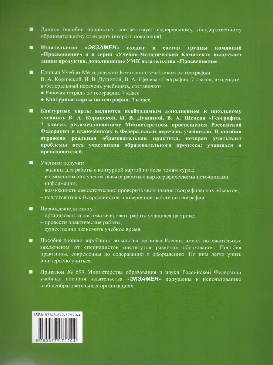 Контурные карты являются необходимым дополнением к школьному учебнику В.А. Коринской, И.В. Душиной, В.А. Щенева А. И. "География 7 класс", рекомендованному Министерством просвещения Российской Федерации и включенному в Федеральный перечень учебников.