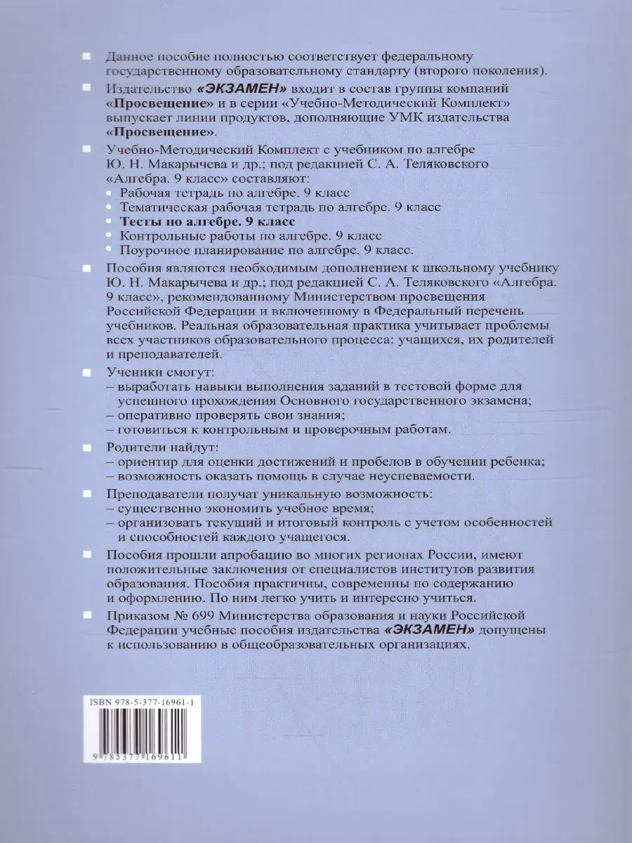 Данное пособие полностью соответствует федеральному государственному образовательному стандарту (второго поколения). Книга является необходимым дополнением к школьному учебнику Ю. Н. Макарычева и др. "Алгебра. 9 класс" (издательство "Просвещение"), рекомендованному Министерством просвещения Российской Федерации и включенному в Федеральный перечень учебников.