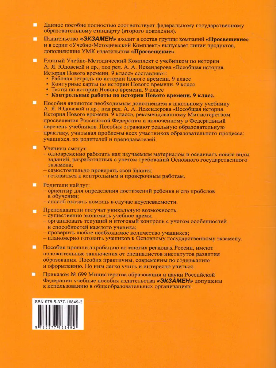 Пособие соответствует содержанию и структуре учебника А. Я. Юдовской и др.; под редакцией А. А. Искендерова по истории Нового времени для 9 класса и содержит контрольные работы (в двух вариантах) к каждому разделу учебника, а также два варианта итоговой контрольной работы по всему курсу истории Нового времени в 9 классе.