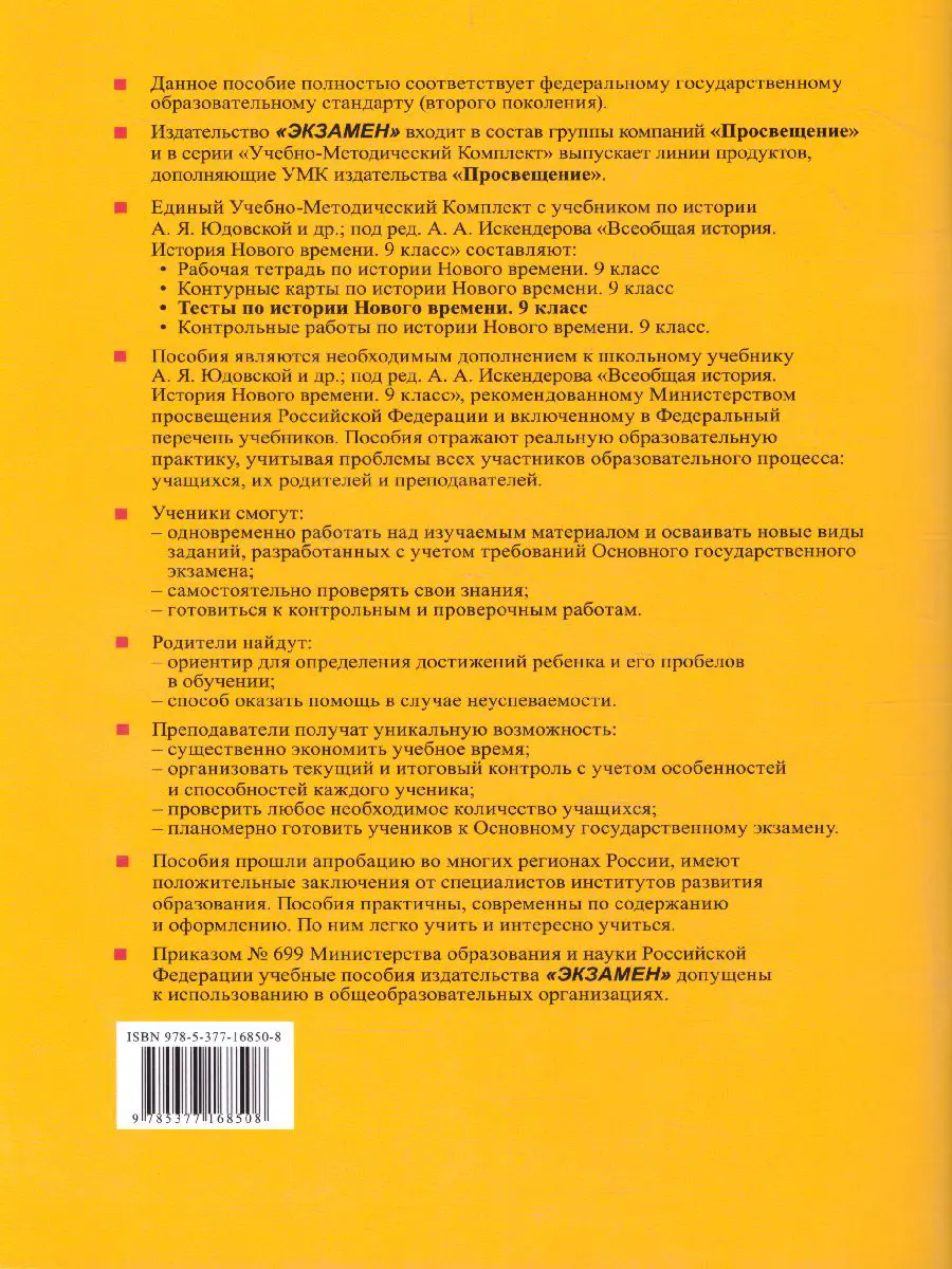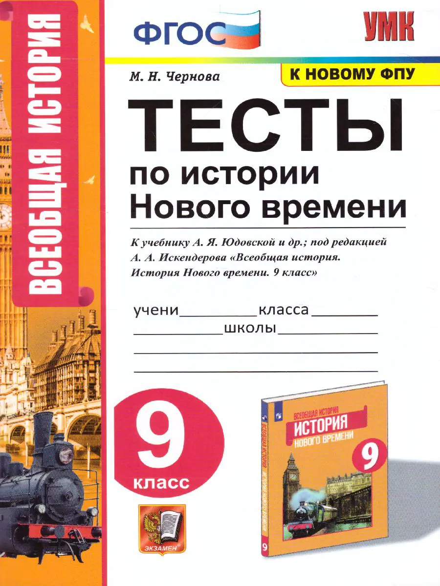 Пособие соответствует содержанию и структуре учебника А. Я. Юдовской и др.; под редакцией А. А. Искендерова по истории Нового времени для 9 класса и содержит тесты (в двух вариантах) к каждому параграфу учебника.