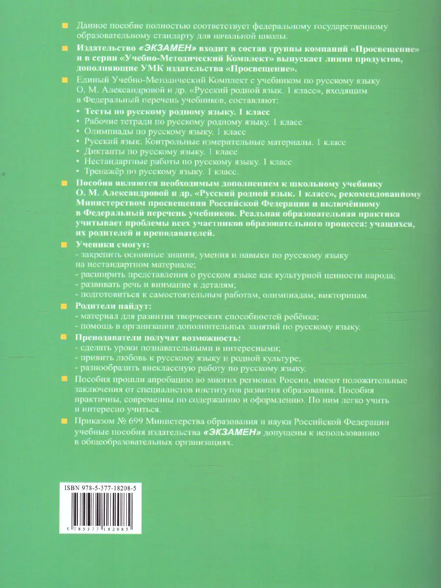 В сборнике представлены тестовые задания, составленные в чётком соответствии с содержанием учебника "Русский родной язык. 1 классасс" О. М. Александровой и др.