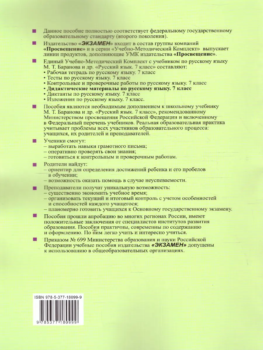 Дидактические материалы подобраны в соответствии с логикой структуры и содержания учебника русского языка для 7-го класса М. Т. Баранова, Т. А. Ладыженской и др., однако они могут быть использованы и при работе по другим учебникам русского языка, входящим в Федеральный перечень учебников.