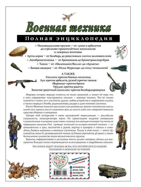 Энциклопедия «Военная техника» расскажет, как развивалась военно-техническая мысль, какой путь прошла она от каменного века до наших дней, как совершенствовались средства обороны и нападения. Мы проведем вас по истории военной техники — от копьеметалки и лука, пистолетов и ружей, мортир и кулеврин к танкам и самолетам, боевым машинам и военным спутникам. Специалисты по истории военной техники рас