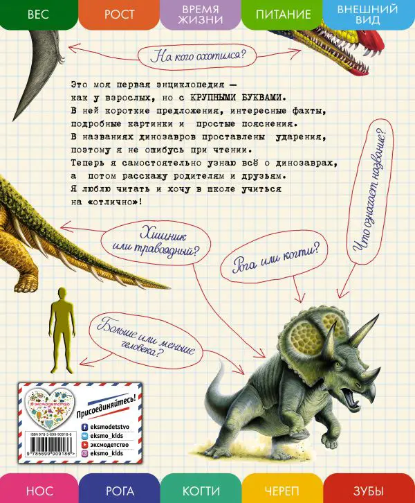 Это настоящая энциклопедия для детей: все только самое важное, легко запоминающееся — и с крупными буквами. В книге с большими и подробными рисунками собраны интересные сведения о 223 хищных и травоядных динозаврах.
