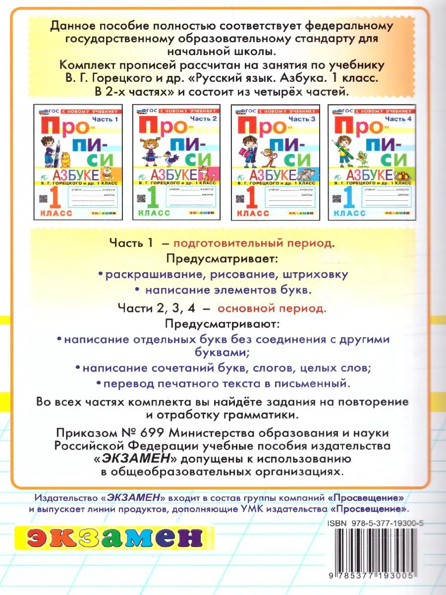 Данное пособие полностью соответствует федеральному государственному образовательному стандарту для начальной школы. Комплект прописей предназначен для занятий по учебнику В. Г. Горецкого и др. "Русский язык. Азбука. 1 класс. В 2-х частях" и состоит из четырёх частей.