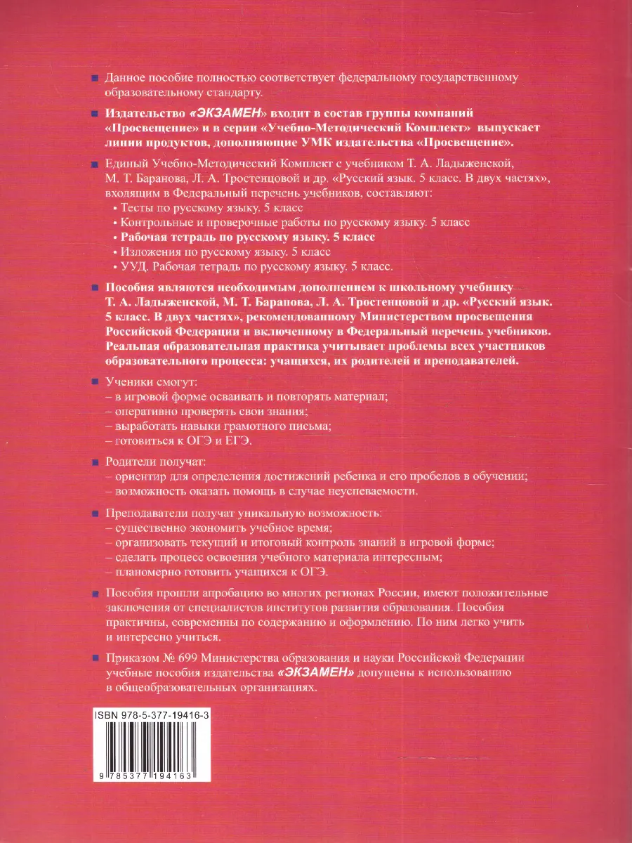 Русский язык. 5 класс. Рабочая тетрадь. Часть 2. УМК Ладыженская. ФГОС новый. (к новому учебнику)