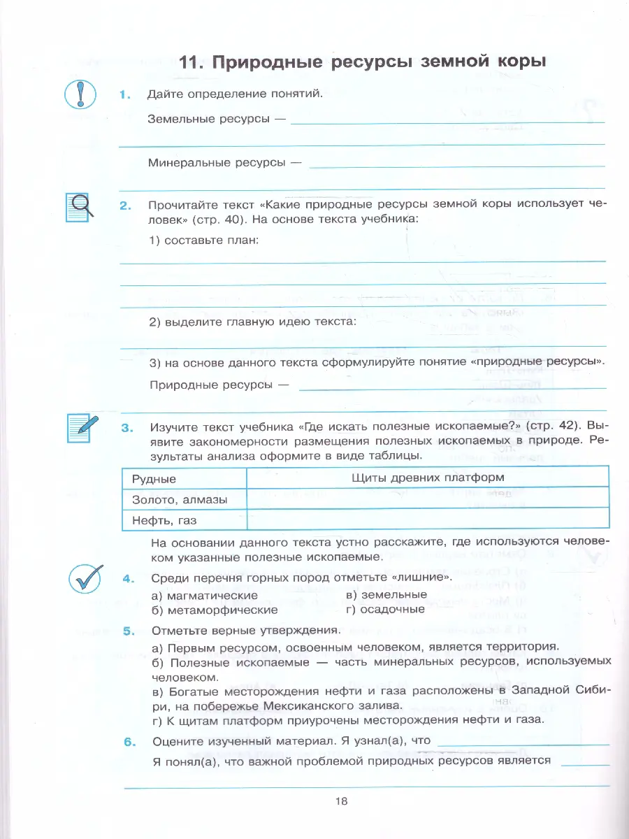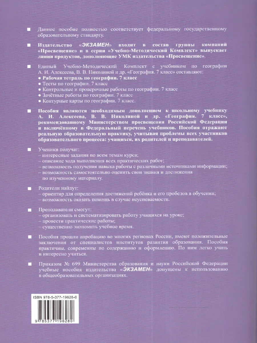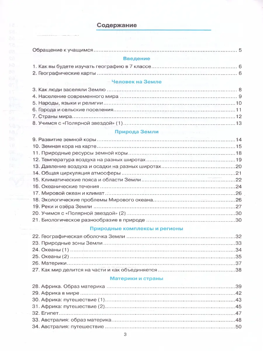В рабочую тетрадь вклассючены необходимые контурные карты и задания по работе с ними. Особый раздел составляет проектно-исследовательский блок, реализующий практико-ориентированную составляющую курса географии, а также рефлексивно-оценочный блок, помогающий определить успехи в обучении.