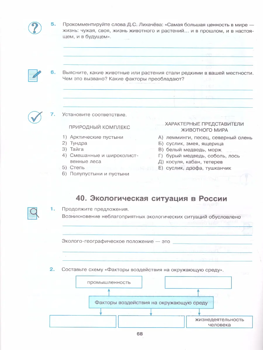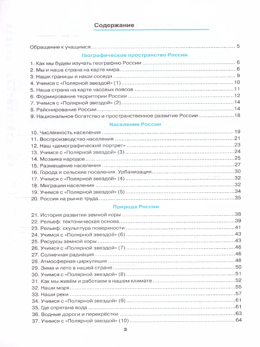 В рабочую тетрадь вклассючены необходимые контурные карты и задания по работе с ними. Особый раздел составляет проектно-исследовательский блок, реализующий практико-ориентированную составляющую курса географии, а также рефлексивно-оценочный блок, помогающий определить успехи в обучении.