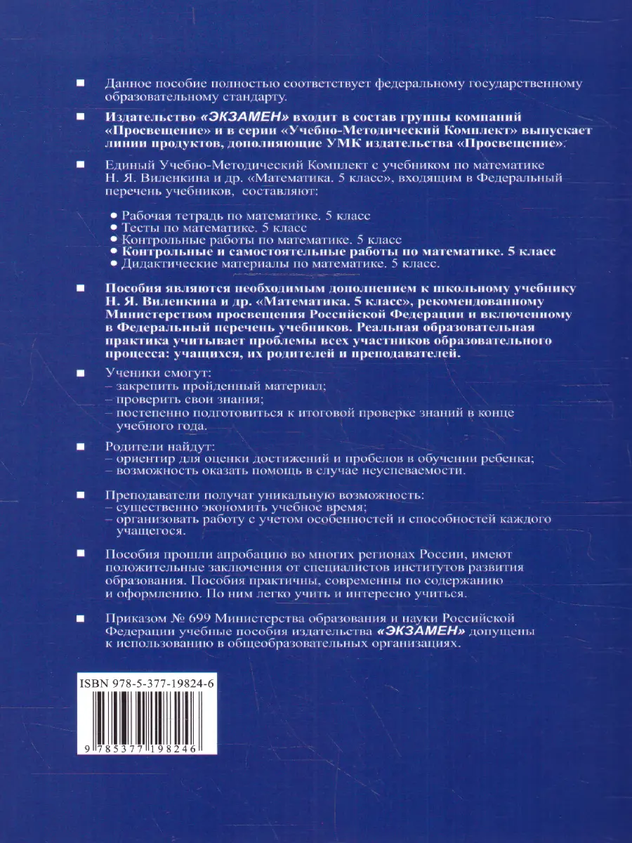Пособие является необходимым дополнением к школьному учебнику Н. Я. Виленкина и др. "Математика. 5 классасс", рекомендованному Министерством просвещения Российской Федерации и вклассюченному в Федеральный перечень учебников.