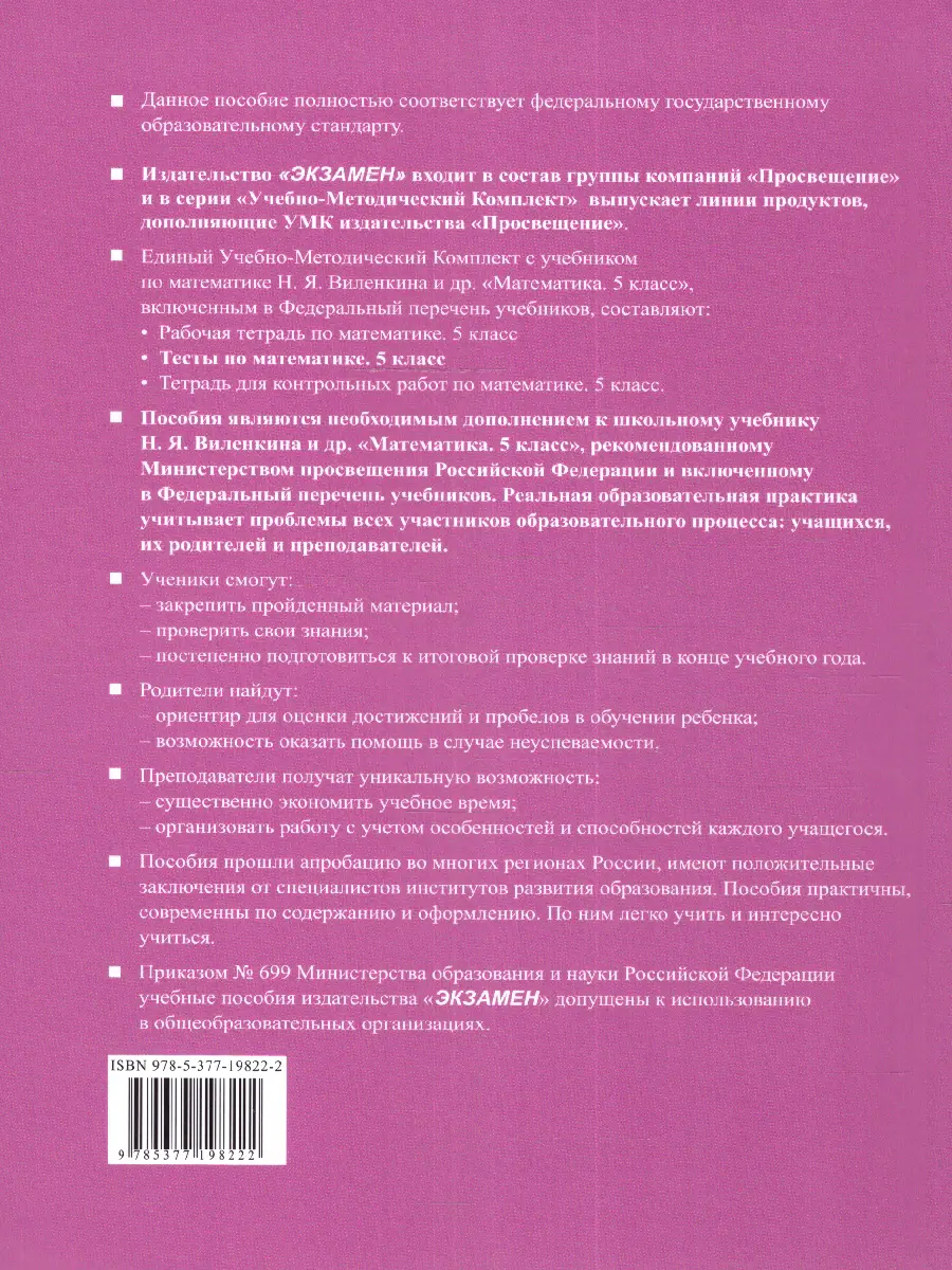"Тесты по математике. 5 классасс" являются составной частью учебно-методического комплекта к учебнику Н. Я. Виленкина и др. "Математика. 5 класс. В двух частях".