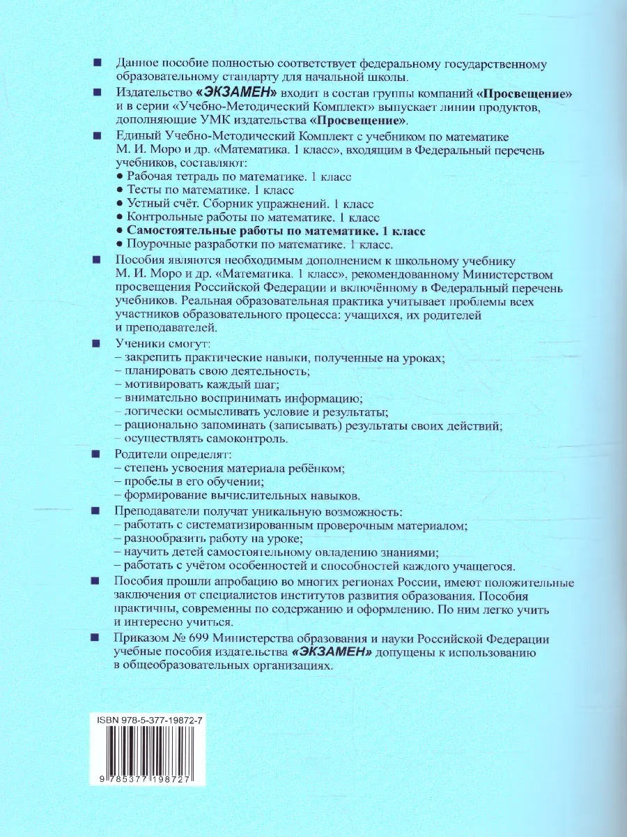 Пособие является необходимым дополнением к учебнику М. И. Моро и др. "Математика. 1 класс. В 2-х частях", рекомендованному Министерством просвещения Российской Федерации и включённому в Федеральный перечень учебников.