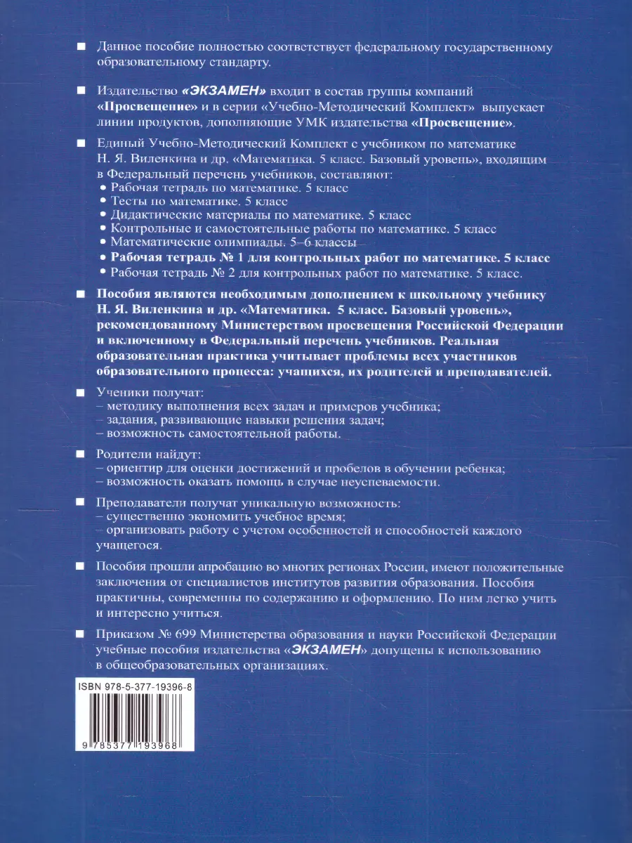 Математика 5 класс. Рабочая тетрадь №1 для контрольных работ к учебнику Н. Я. Виленкина. ФГОС.