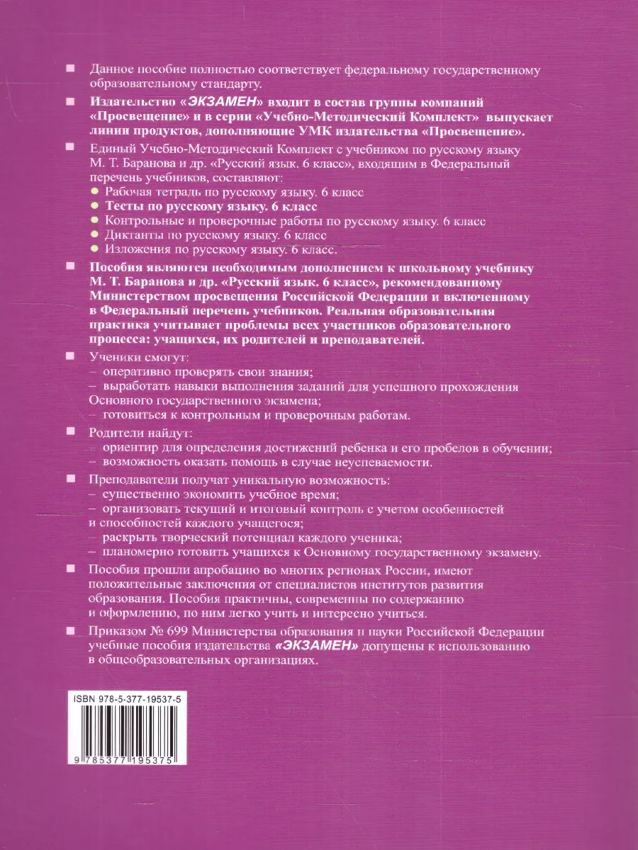 Пособие позволяет не только проверить уровень освоения учащимися изучаемого материала, но и совершенствовать практические умения, связанные с анализом различных языковых явлений, а также постепенно готовить шестиклассассников к решению тестовых заданий, являющихся важной составляющей Основного государственного экзамена и Единого госуарственного экзамена по русскому языку.