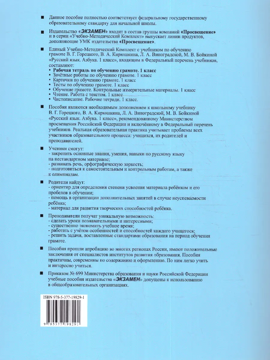 Данное пособие полностью соответствует федеральному государственному образовательному стандарту для начальной школы. Рабочая тетрадь построена в соответствии с авторской программой по обучению грамоте В. Г. Горецкого и др.
