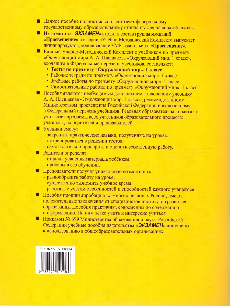 В предлагаемом пособии представлены тесты по всем темам учебного комплекта А. А. Плешакова "Окружающий мир. 1 классасс". Этот материал также может быть использован учителями, работающими по другим учебникам.