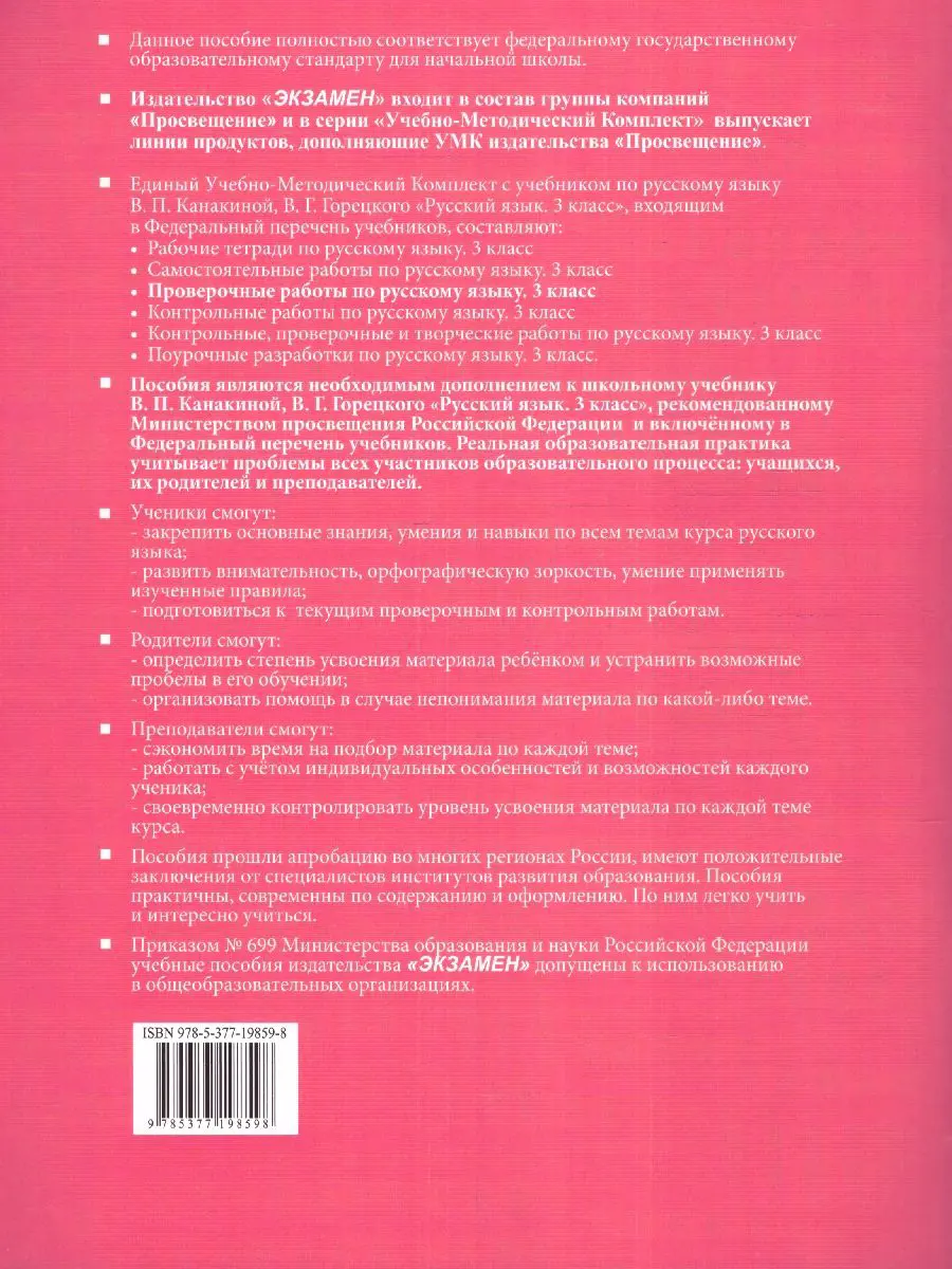 Пособие направлено на проверку, отработку и закрепление знаний по всем темам курса "Русский язык. 3 класс. В 2-х частях" (авт. В. П. Канакина, В. Г. Горецкий).