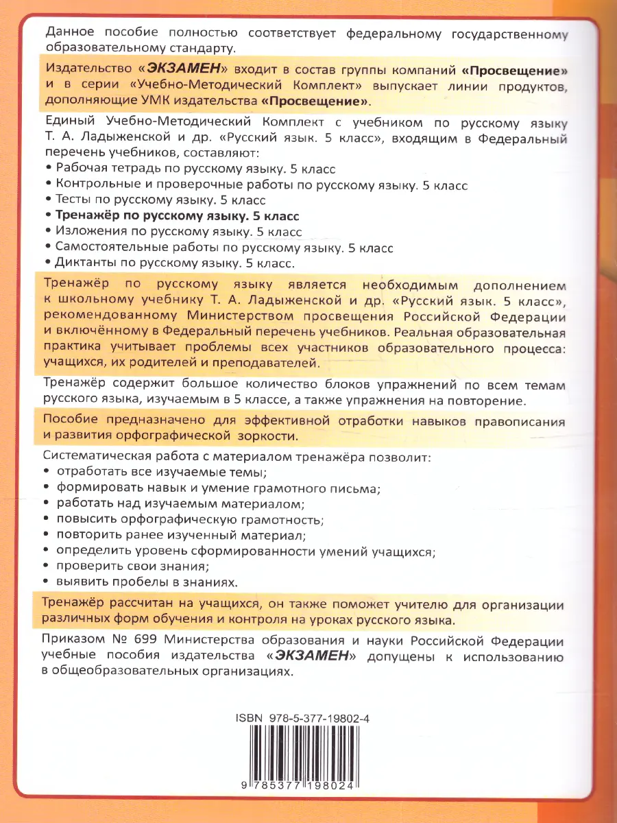 Данное пособие полностью соответствует федеральному государственному образовательному стандарту. Тренажёр содержит большое количество упражнений по всем темам, изучаемым в 5-м классе.