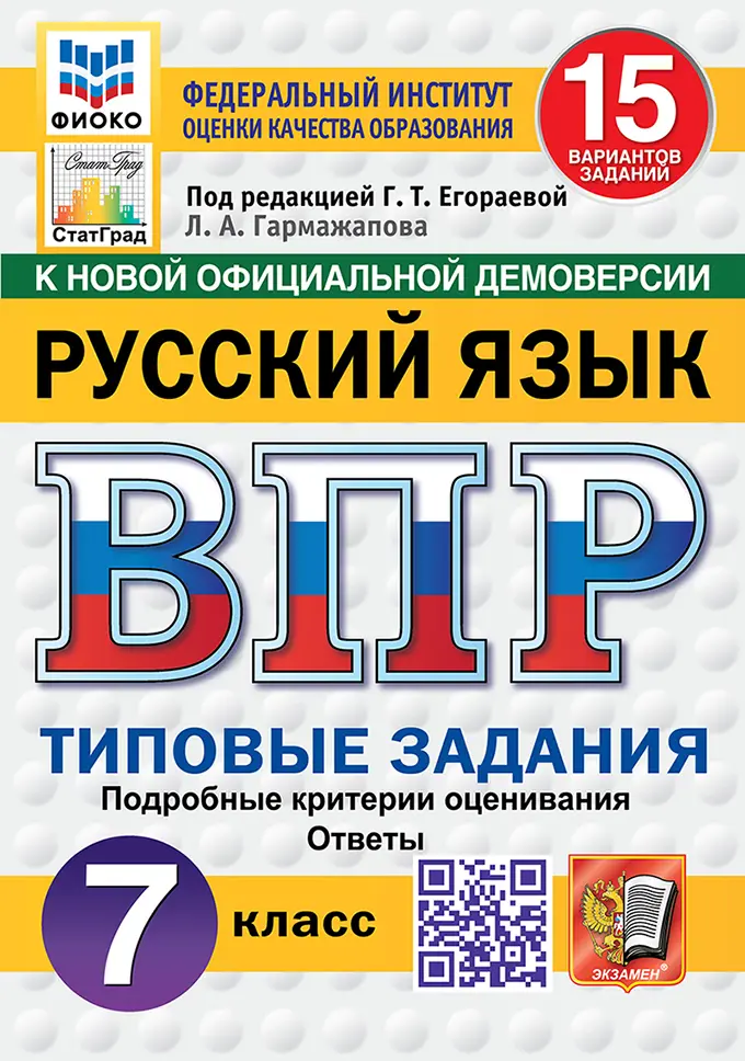Всероссийские проверочные работы (ВПР). Русский язык. 7 класс. 15 типовых заданий. ФИОКО. Статград. ФГОС Новый