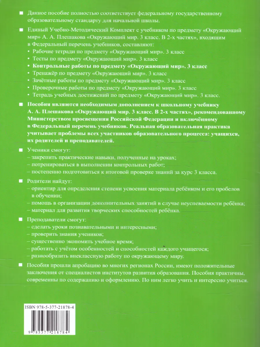 Окружающий мир 3 класс. Контрольные работы. Часть 1. Данное учебно-методическое пособие полностью соответствует требованиям ФГОС начального общего образования и предназначено для организации тематического контроля знаний учащихся 3 класса по предмету "Окружающий мир". Материалы сборника разработаны в соответствии с содержанием учебника А.А. Плешакова "Окружающий мир. 3 класс" (часть 1) и отражают современный компетентностный подход в обучении. Пособие включает систему контрольных работ, позволяющих оценить не только предметные знания учащихся, но и сформированность универсальных учебных действий. Особое внимание уделено развитию у школьников способности применять полученные знания в практических ситуациях. Все задания методически выверены и соответствуют возрастным особенностям третьеклассников. Сборник предоставляет учителям надежный инструмент для проведения текущего и итогового контроля, помогая объективно оценить уровень освоения учебной программы каждым учеником.