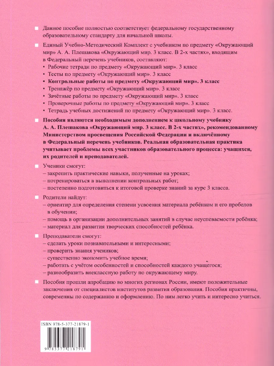 Окружающий мир 3 класс. Контрольные работы. Часть 2. Данное учебно-методическое пособие полностью соответствует требованиям ФГОС начального общего образования и предназначено для организации тематического контроля знаний учащихся 3 класса по предмету "Окружающий мир". Материалы сборника разработаны в соответствии с содержанием учебника А.А. Плешакова "Окружающий мир. 3 класс" (часть 2) и отражают современный компетентностный подход в обучении. Пособие включает систему контрольных работ, позволяющих оценить не только предметные знания учащихся, но и сформированность универсальных учебных действий. Особое внимание уделено развитию у школьников способности применять полученные знания в практических ситуациях. Все задания методически выверены и соответствуют возрастным особенностям третьеклассников. Сборник предоставляет учителям надежный инструмент для проведения текущего и итогового контроля, помогая объективно оценить уровень освоения учебной программы каждым учеником.