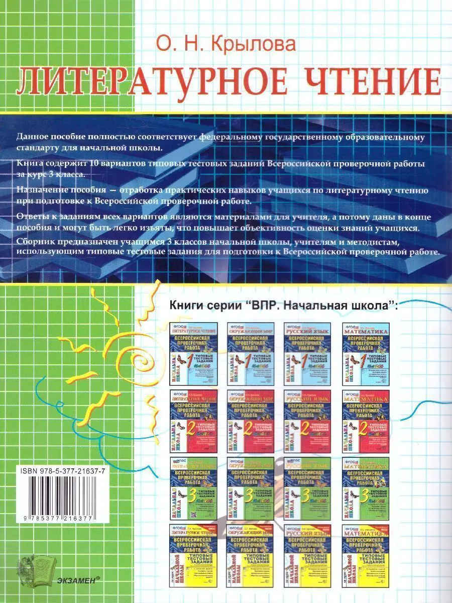 ВПР Литературное чтение 3 класс. Типовые тестовые задания. Итоговая аттестация. ФГОС НОВЫЙ. Данное пособие полностью соответствует федеральному государственному образовательному стандарту для начальной школы. Книга содержит 10 вариантов типовых тестовых заданий Всероссийской проверочной работы за курс 3-го класса. Назначение пособия - отработка практических навыков учащихся по литературному чтению при подготовке к Всероссийской проверочной работе. Ответы к заданиям всех вариантов являются материалами для учителя, а потому даны в конце пособия и могут быть легко изъяты, что повышает объективность оценки знаний учащихся. Сборник предназначен учащимся 3-х классов начальной школы, учителям и методистам, использующим типовые задания для подготовки к Всероссийской проверочной работе.