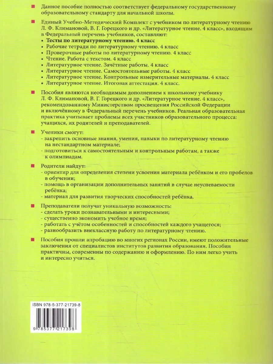 Литературное чтение 4 класс. Тесты. К новому учебнику. ФГОС НОВЫЙ. Данное пособие полностью соответствует федеральному государственному образовательному стандарту для начальной школы. Предлагаемое пособие адресовано учащимся 4-х классов начальной школы. Тестовые задания различного уровня сложности ориентированы на текущий контроль и оценку знаний учащихся по литературному чтению. Тесты могут выборочно использоваться для организации контрольных проверок при оценивании достижений учеников по литературному чтению. Материалы разработаны в соответствии с программой по литературному чтению и могут быть использованы как система оценки школьной успеваемости. Тесты могут использоваться при прохождении материала по любой программе.