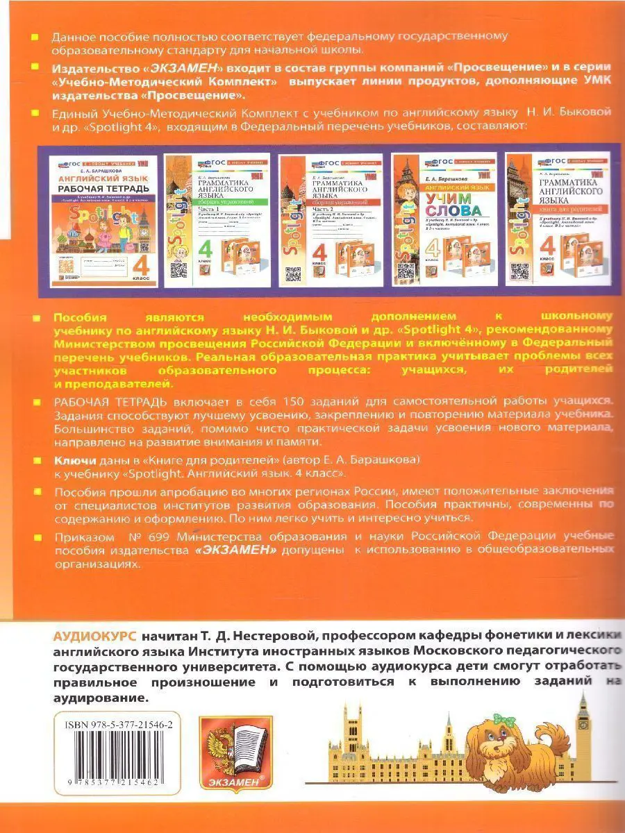Данное пособие полностью соответствует федеральному государственному образовательному стандарту для начальной школы. Оно является составной частью учебно-методического комплекта (автор Барашкова Е. А.) для учащихся 4-го класса, состоящего из шести книг: - РАБОЧАЯ ТЕТРАДЬ. Английский язык. 4 класс - УЧИМ СЛОВА.