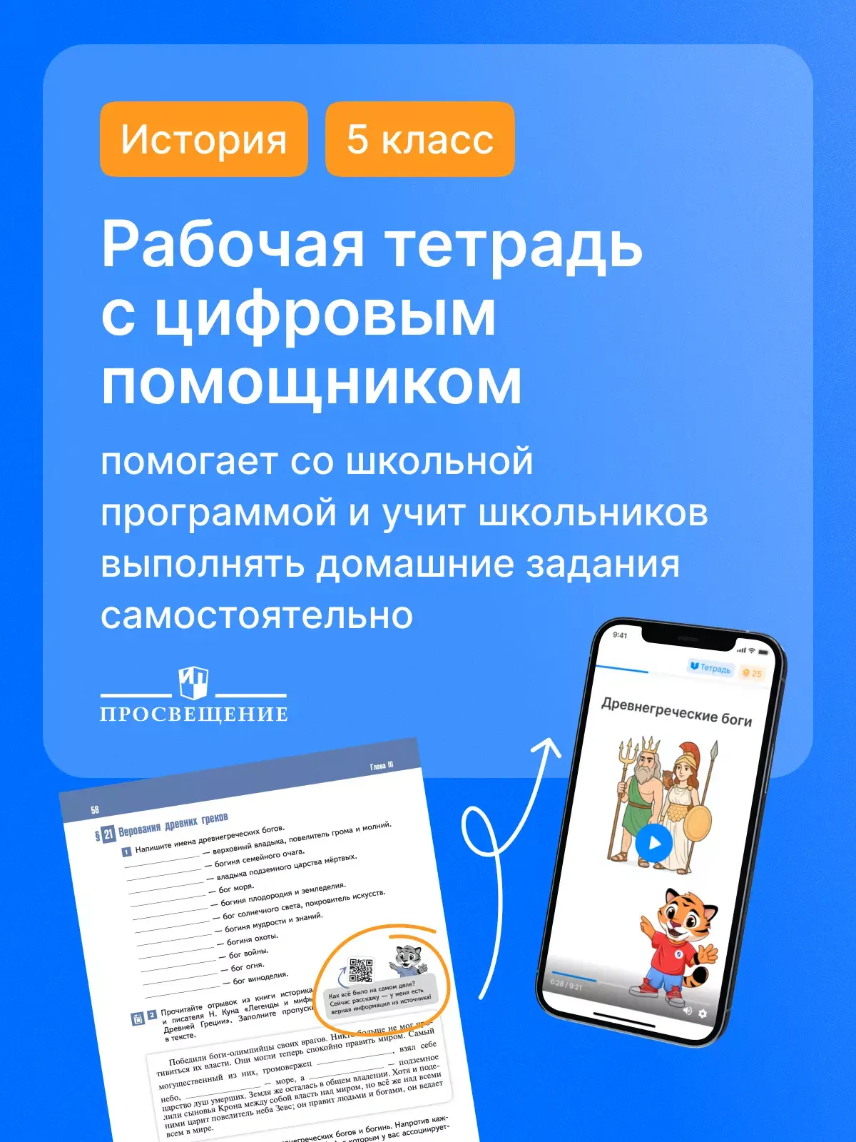Рабочая тетрадь с цифровым помощником является частью учебно-методического комплекта для 5 класса по всеобщей истории авторов В. Р. Мединского, А.О. Чубарьяна. Тетрадь содержит задания к контурным картам, иллюстрациям, фрагментам из исторических источников и сочинений историков и др.; может быть использована для закрепления знаний, учащихся на уроке, во время итогового повторения и при выполнении домашних заданий. На страницах тетради живёт цифровой помощник — тигрёнок Тёмка. Он поможет разобраться в темах, подготовиться к урокам, окажет поддержку при выполнении домашнего задания. Сканируйте QR-коды — и попадёте на страницы с разборами заданий, полезными подсказками, теорией и дополнительными материалами.