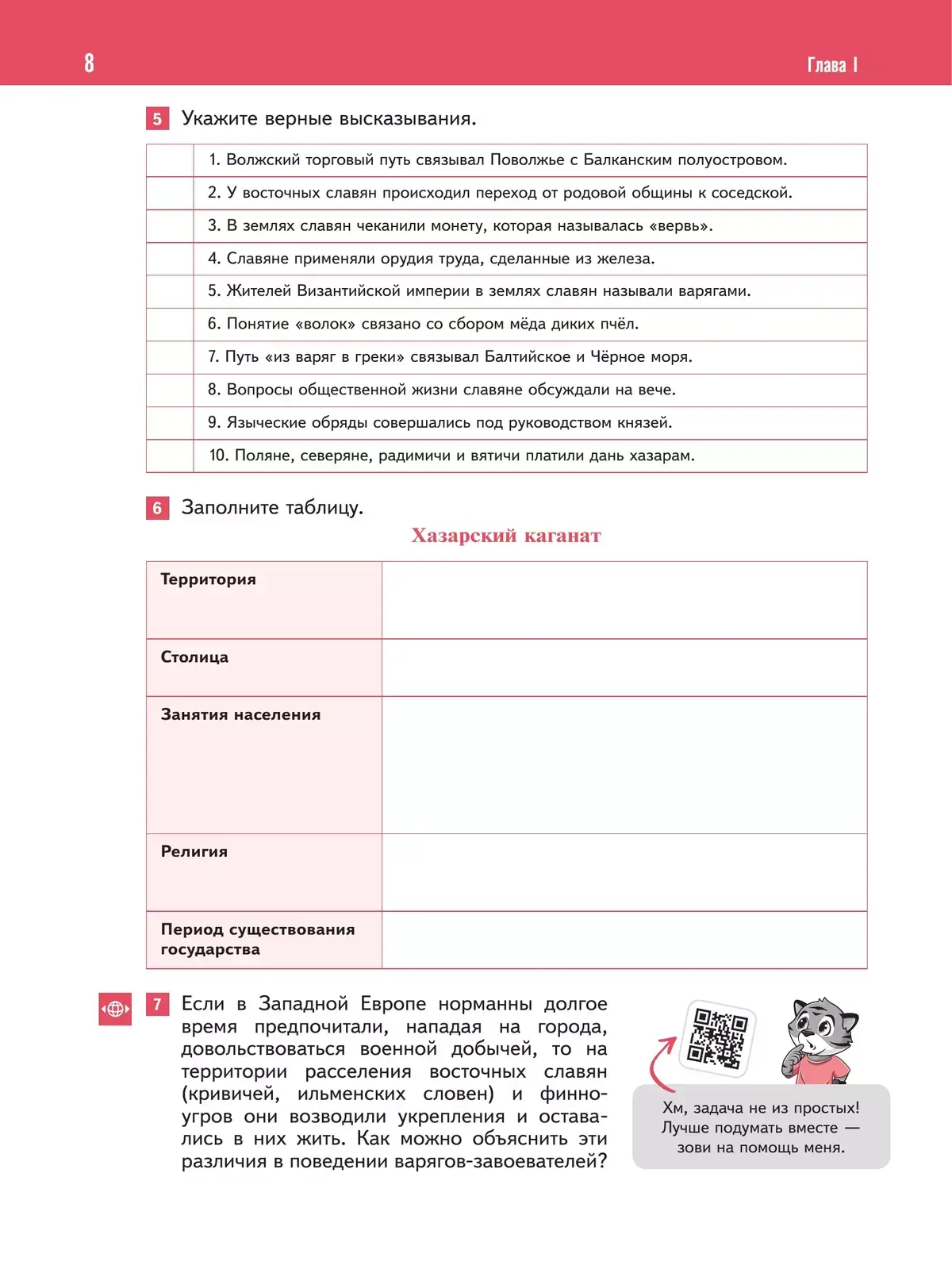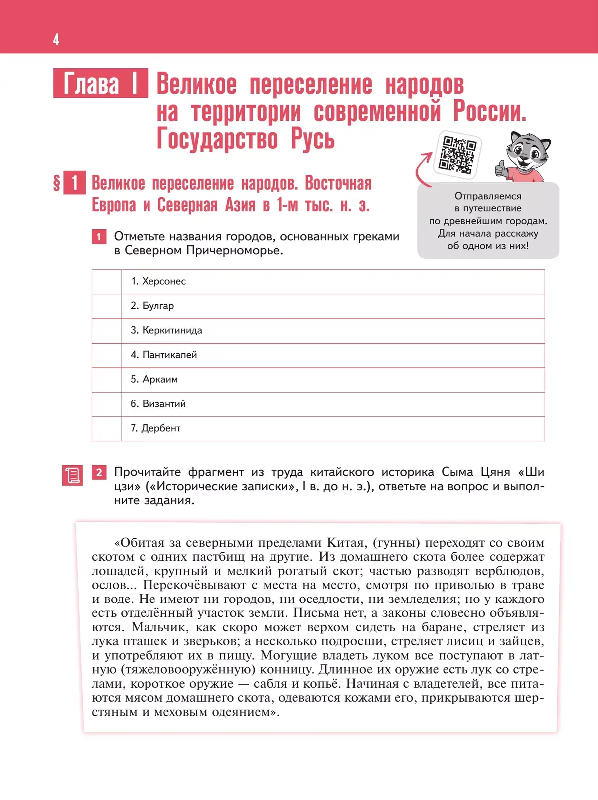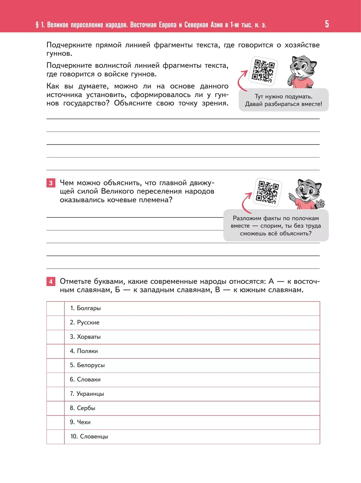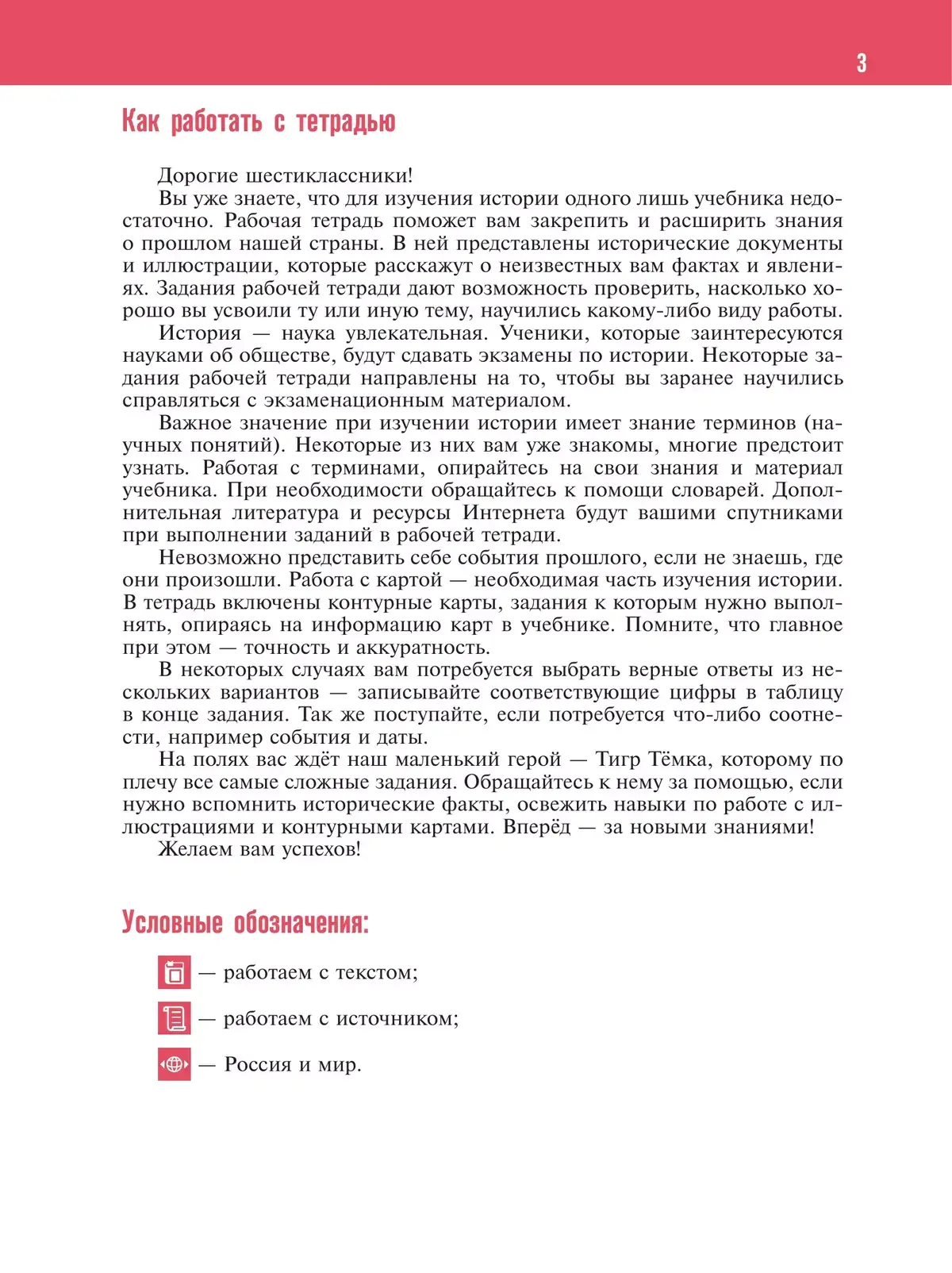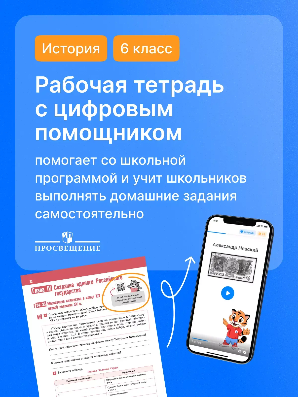 Рабочая тетрадь с цифровым помощником является частью учебно-методического комплекта для 6 класса по истории России авторов В. Р. Мединского, А. В. Торкунова. Тетрадь содержит задания к контурным картам, иллюстрациям, фрагментам из исторических источников и сочинений историков и др.; может быть использована для закрепления знаний учащихся на уроке, во время итогового повторения и при выполнении домашних заданий. На страницах тетради живёт цифровой помощник – тигрёнок Тёмка. Он поможет разобраться в темах, подготовиться к урокам, окажет поддержку при выполнении домашнего задания. Сканируйте QR-коды – и попадёте на страницы с разборами заданий, полезными подсказками, теорией и дополнительными материалами.