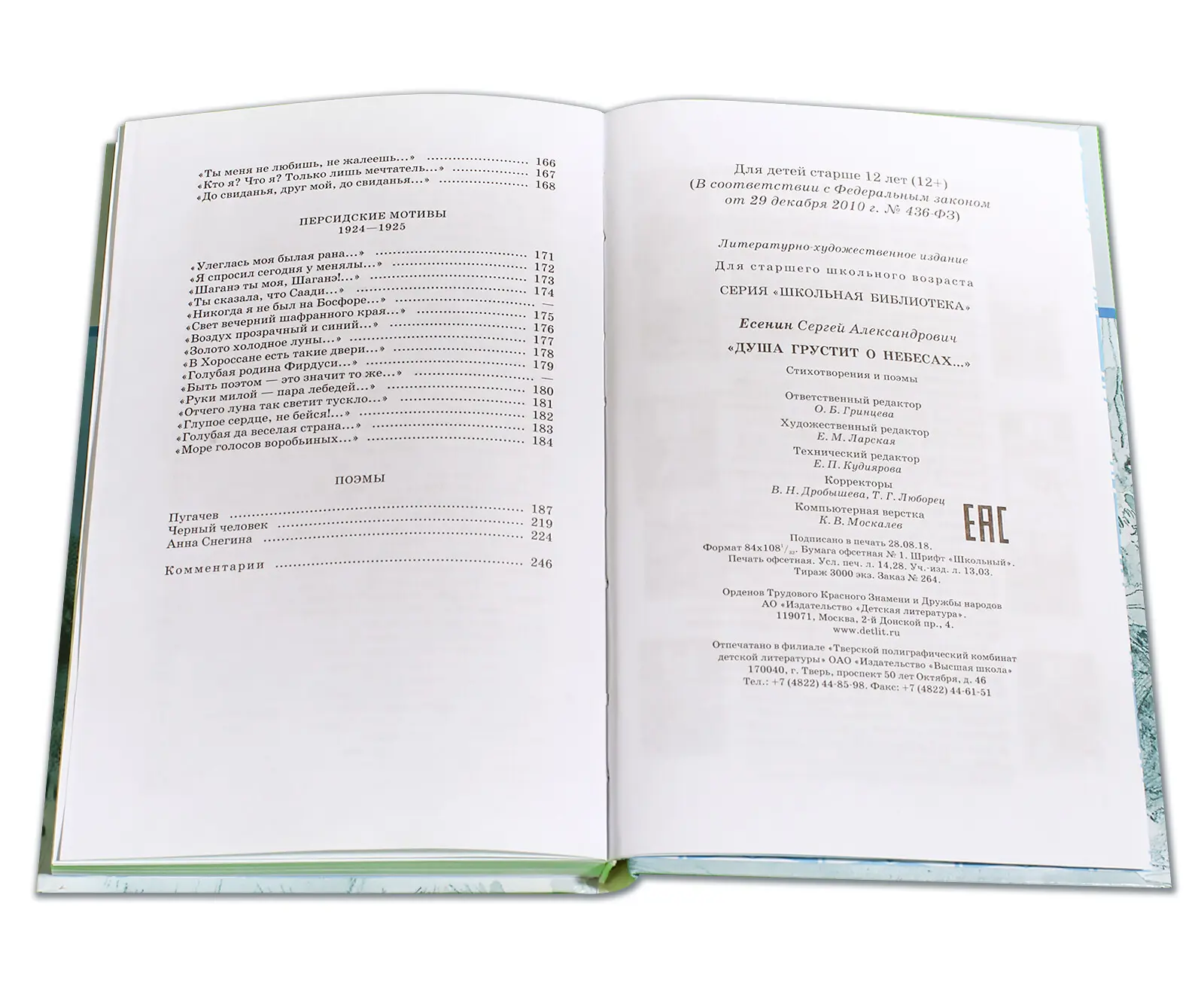 В сборник великого русского поэта вошли его широко известные стихотворения: "Разбуди меня завтра рано...", "Я последний поэт деревни...", "Исповедь хулигана", "Не жалею, не зову, не плачу..." и др., и поэмы: "Пугачев", "Черный человек", "Анна Снегина".