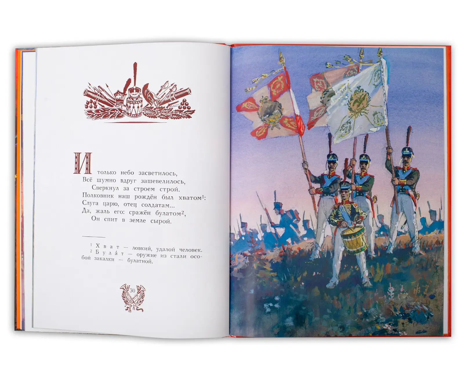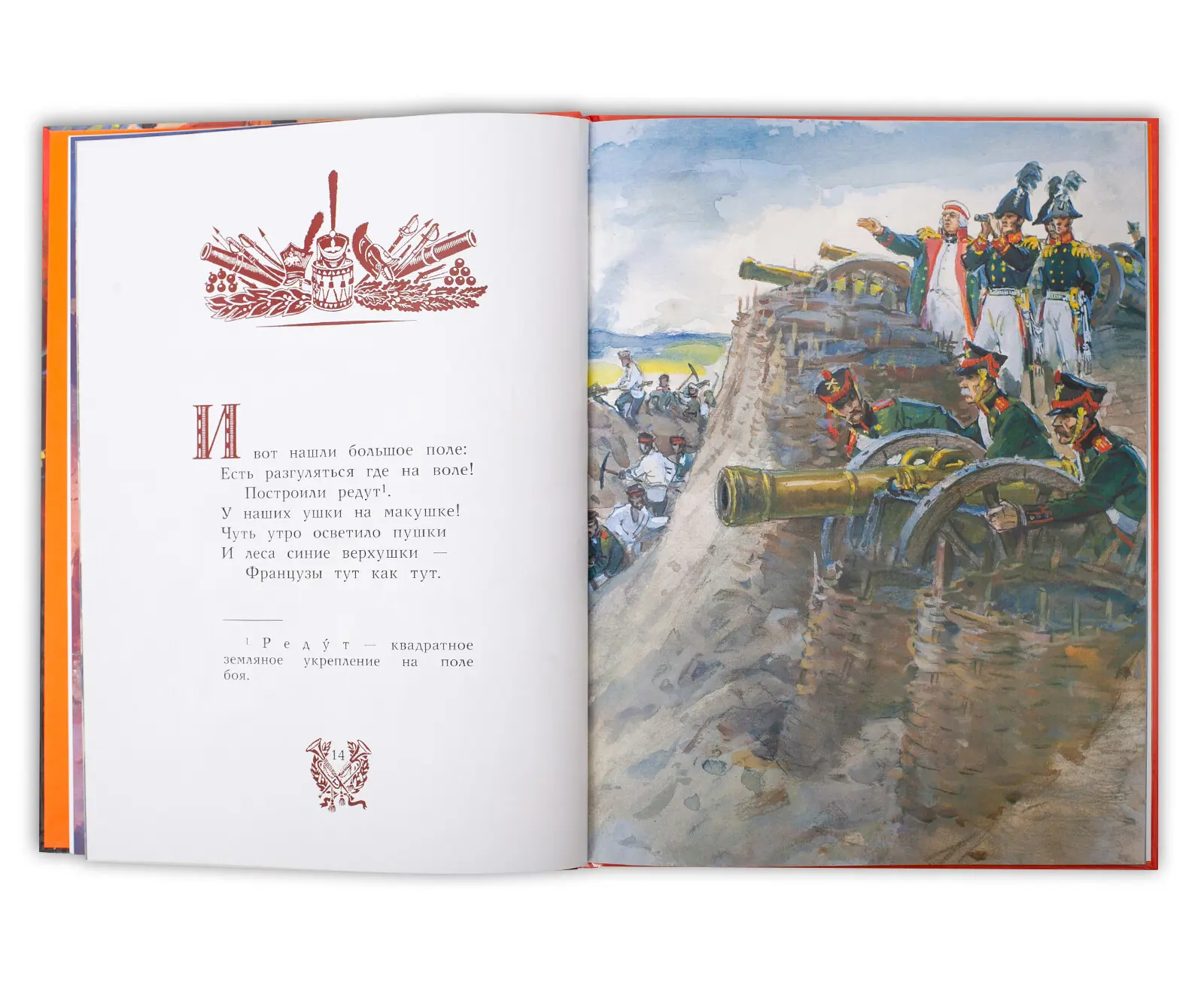 Известное стихотворение Михаила Юрьевича Лермонтова о знаменитом сражении Отечественной войны 1812 года с иллюстрациями выдающегося художника Владимира Гавриловича Шевченко, который сумел передать масштаб битвы, изобразить исторически верное расположение участников на Бородинском поле, соблюсти все детали вооружения, амуниции и обмундирования войск.