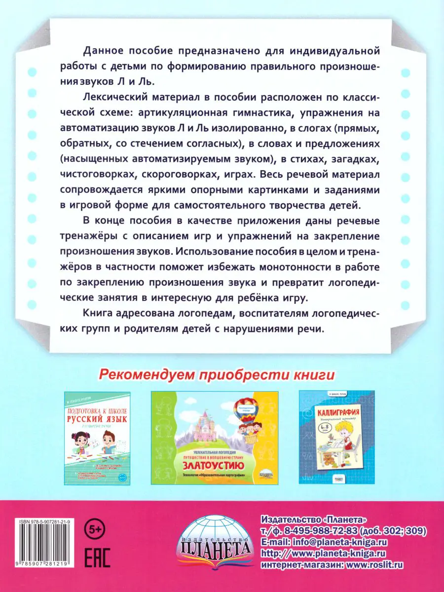 Данное пособие предназначено для индивидуальной работы с детьми по формированию правильного произношения звуков Л и Ль.